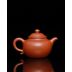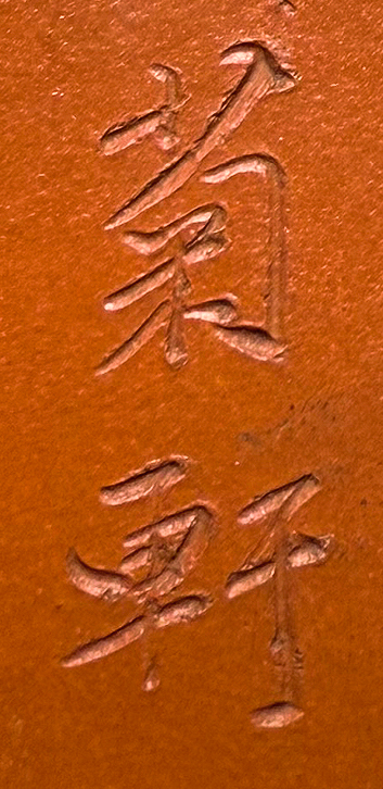 所用胎泥為細緻朱泥,色澤橙紅而溫潤,肌理緊密均勻,表面光澤柔和內斂。器表未施雕飾,純以形制與泥色取勝,展現簡約素雅之美。壺底陰刻「菊軒」二字篆書款,筆意流暢,刻劃清晰。蓮子壺因形飽滿圓潤,如蓮實之狀而得名,其意象清淨高潔,風格素樸含蓄,為文人茶席中常見之經典式樣。