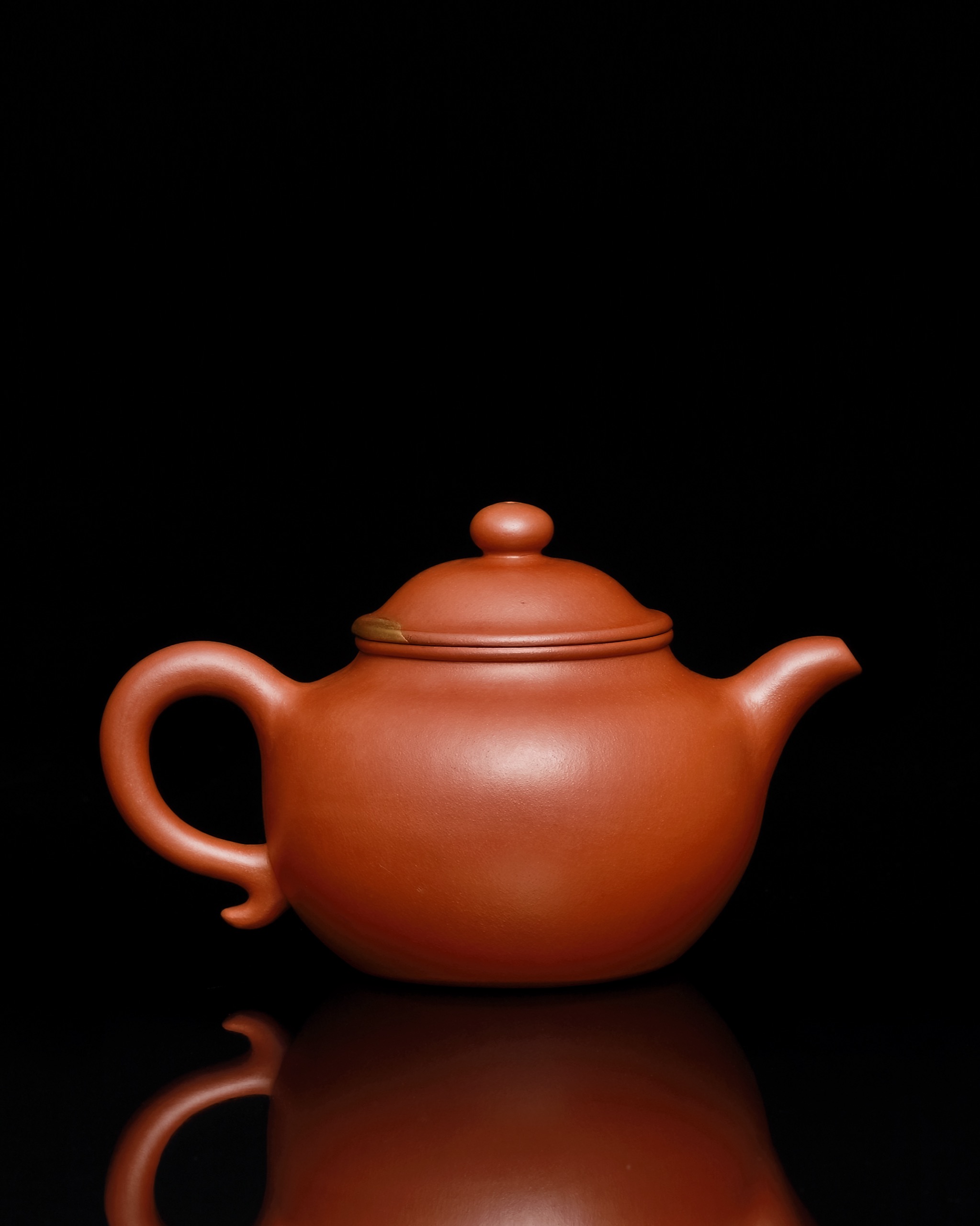 此壺造形渾圓飽滿,器體周正,結構嚴整,比例得當,整體予人穩重厚實之感。壺腹圓鼓,線條轉折圓潤流暢,承接自然。壺嘴短翹微昂,出口略呈圓錐,與壺身過渡無痕。壺把作橢圓曲弧,尾端微翹如鉤,形象靈巧,亦便於提握施力,兼具實用性與美感。壺蓋略作隆起,緊貼壺肩,蓋緣見有金繕修補。鈕作寶珠形,挺拔端正,居中穩固,於簡潔之中見巧思。