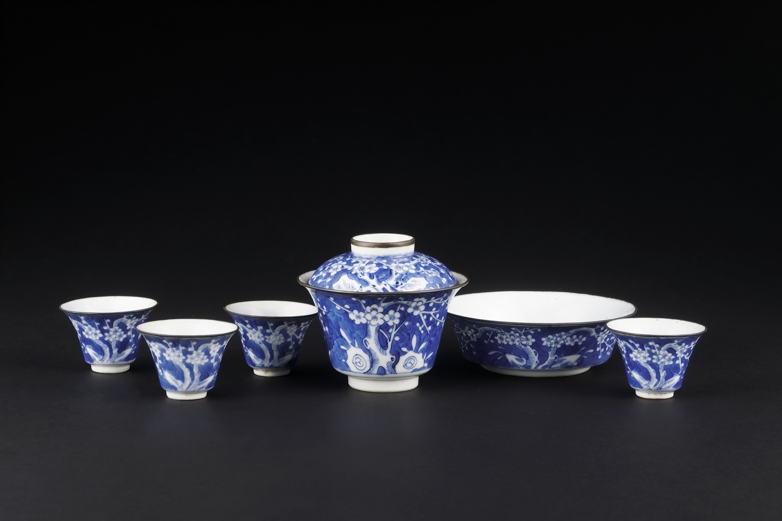 本組為潮汕地區典型工夫茶具套組,計有蓋盅一件、茶盅四件與茶船一件,共六件,器形配置完整。蓋盅用以沖泡,茶盅供品茗之用,茶船則承納溢水或置放茶盅,實用功能清晰,體現工夫茶文化對細節與儀式感之講究。全器口沿均包以錫邊,既具保護作用,亦與茶席風格相互呼應,為閩粵地區茶具常見之工藝特徵。