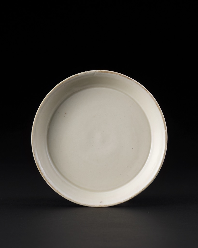 此件定窯淺口盤,器形小巧,口緣侈展,壁淺微斂,平底微隆,結構簡約勻稱。全器通施透明釉,釉層凝潤瑩澤,胎骨細白緻密。盤口無釉露胎,形成典型之「芒口」處理,為定窯覆燒工藝之常見特徵。整體造型素潔端雅,無紋無飾,體現宋代定窯器重質輕飾、尚白崇簡之美學精神。