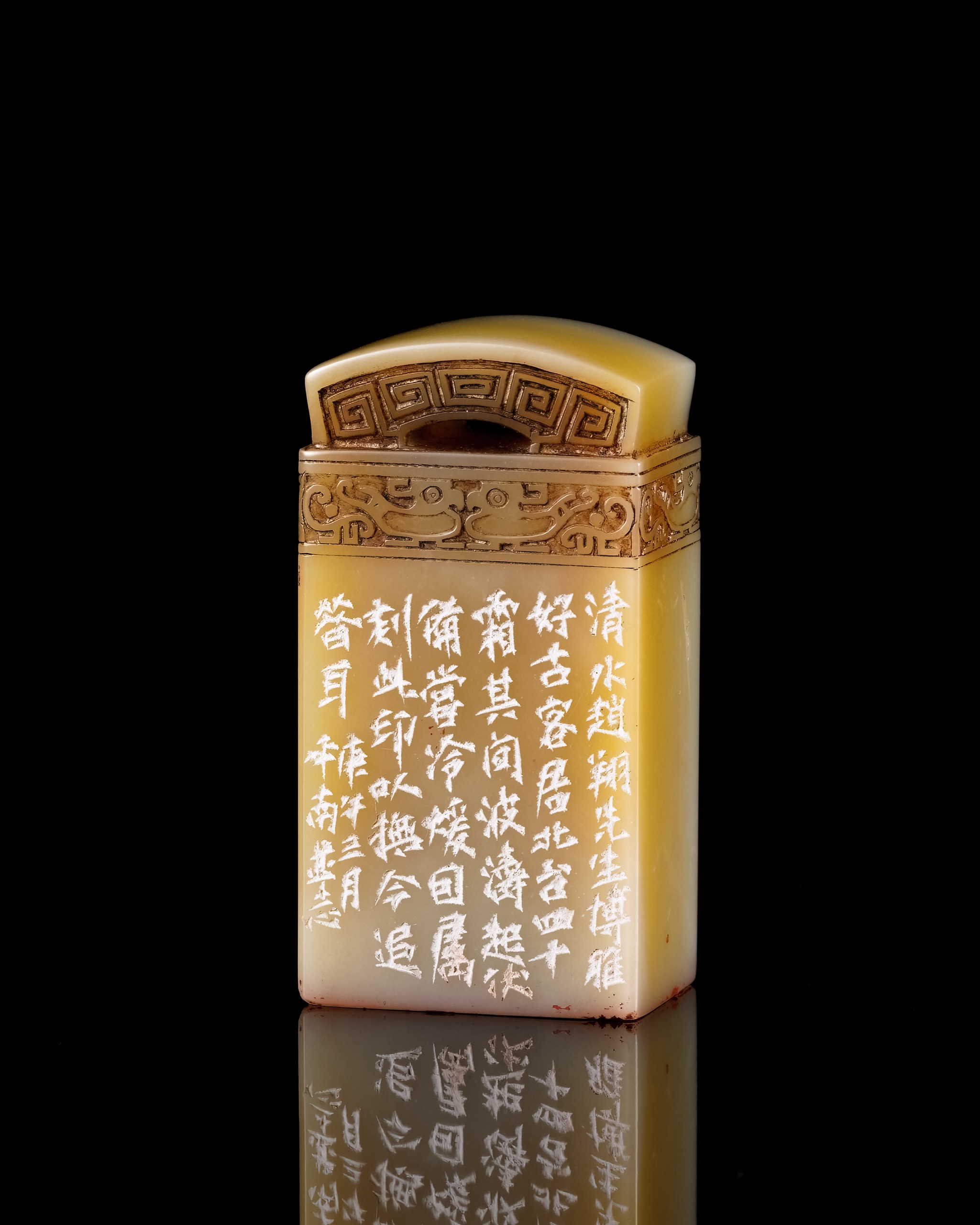 首頁 拍品總覽 2025秋季 share Lot. 1033 薛平南刻 " 過眼雲煙四十年"善伯石章 NT$ 10,000-20,000RMB¥ 2,000-4,000HK$ 2,500-5,000 媒材/尺寸 H5.5cm 款識 印文:〈過眼雲煙四十年〉邊款:「清水趙翔先生博雅好古,客居北台四十霜,其間波濤起伏,備嘗冷暖,屬刻此印以撫今追昔耳,庚午三月,平南並誌。」 登記競投 返回拍品列表 拍品推薦 1115 明隆慶 青花龍鳳呈祥紋六方罐 預估價:NT$ 1,000,000-1,500,000 2025秋季 1040 廖德良雕 金砂善伯獸鈕 方章 等 五方一組 預估價:NT$ 50,000-80,000 2025秋季 1023 晚清/民國 粉彩描金龍紋碗 預估價:NT$ 100,000-150,000 2025秋季 1033 薛平南刻 " 過眼雲煙四十年"善伯石章 預估價:NT$ 10,000-20,000 2025秋季 1073 西藏 14/15世紀 銅鎏金文殊菩薩 預估價:NT$ 300,000-500,000 2025秋季 1057 明 青白玉饕餮紋簋式爐 預估價:NT$ 300,000-400,000 2025秋季 1086 尼泊爾 17世紀 銅鎏金勝樂金剛 預估價:NT$ 1,200,000-1,800,000 2025秋季 1022 晚清 茶葉末三孔葫蘆瓶 預估價:NT$ 100,000-150,000 2025秋季 1060 明 白玉人物山子 預估價:NT$ 800,000-1,000,000 2025秋季 1107 清乾隆 白玉鏤雕「一路連科」擺件 預估價:NT$ 600,000-1,200,000 2025秋季