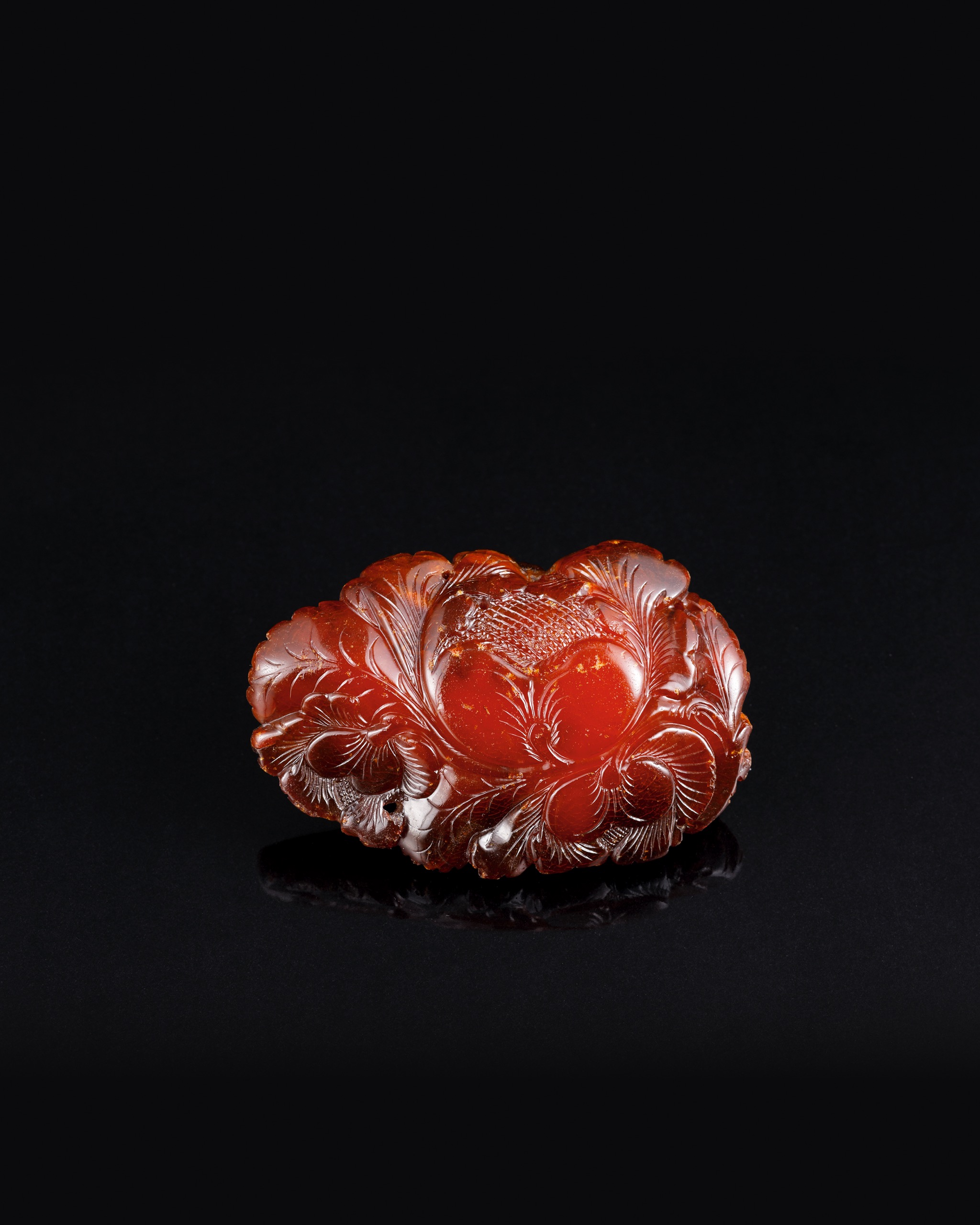 本件琥珀牡丹紋佩飾,通體以橙紅琥珀雕琢而成,質地溫潤透亮,色澤渾厚內斂,呈現天然流蠟與金星閃光交錯之質感。器形隨料而制,略呈橢圓團形,正面以高浮雕技法雕飾盛開牡丹,花心渾圓細密,瓣葉層層翻卷,四周飾以舒展葉片與流動枝蔓,構圖疏密有致,節奏明快。刀法圓熟,轉折婉轉,線條挺拔而富彈性,展現匠人深厚技藝與對自然形態之精微觀察。