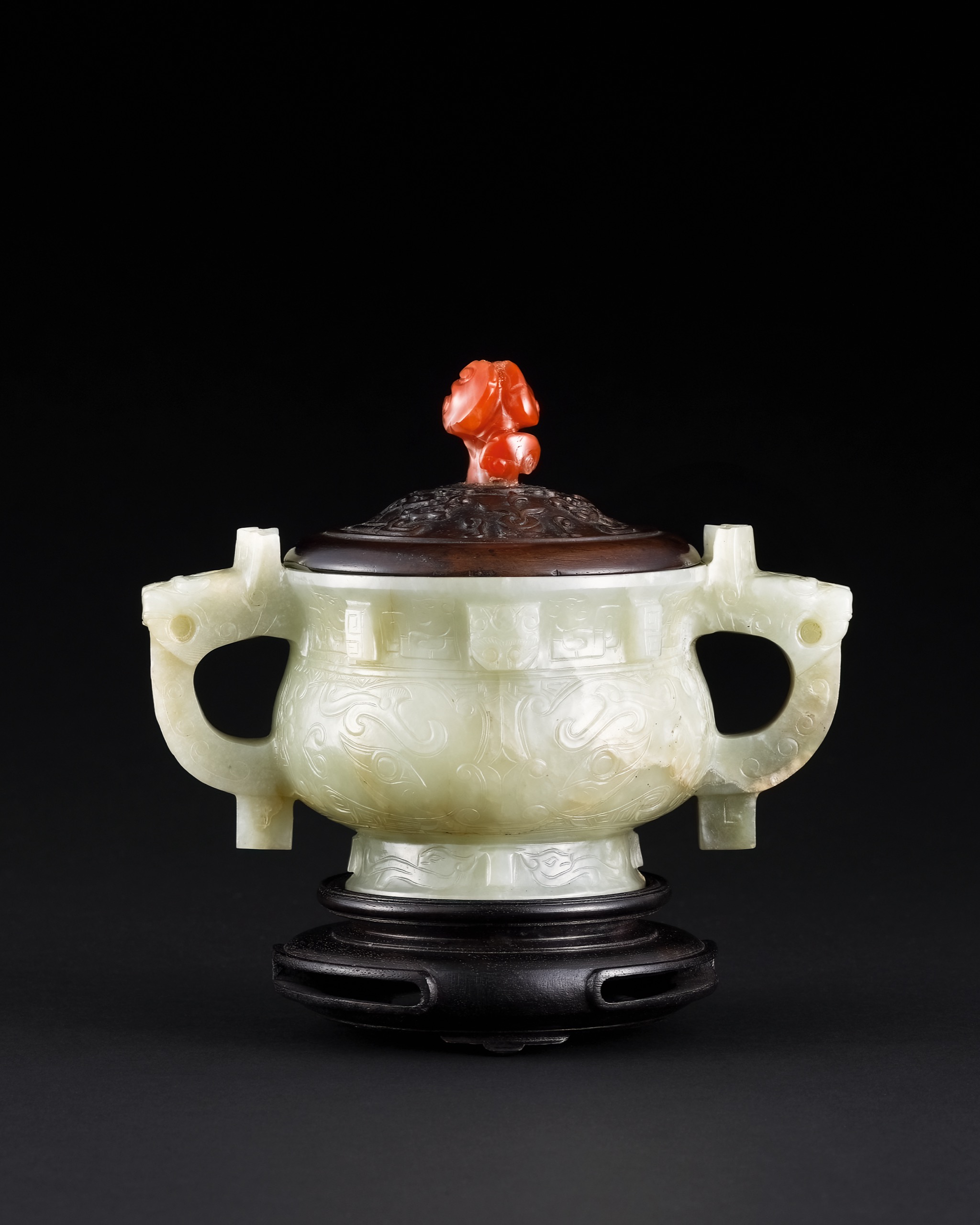 玉質泛青白,溫潤細膩,局部可見褐沁與綹紋,氣息古樸雅致。木蓋為清代所配,做雙龍戲珠紋,龍身翻騰有勢,雕雕技法工整深峻。蓋頂嵌以南紅瑪瑙靈芝形鈕,色澤豔紅明快,質地瑩透。整器造型厚重莊嚴,雕飾繁簡有致,頗具格調。