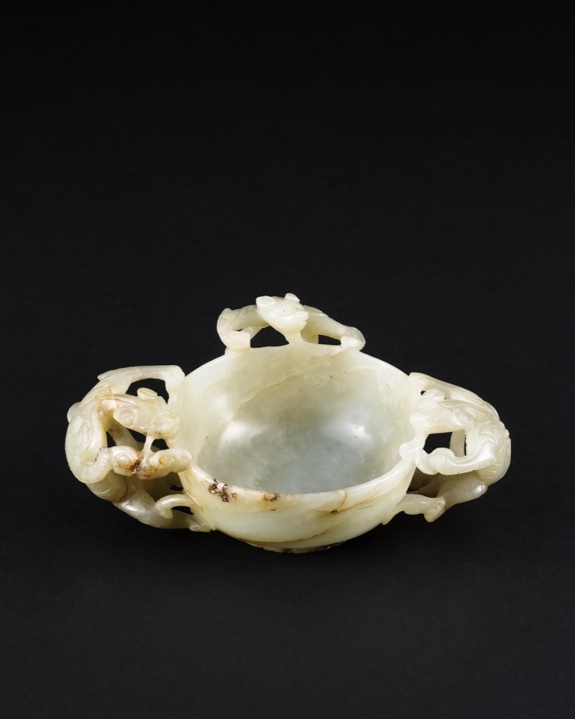 首頁 拍品總覽 2025秋季 share Lot. 1059 明 白玉三螭盃 NT$ 180,000-250,000RMB¥ 36,000-50,000HK$ 45,000-62,500 媒材/尺寸 L11.3cm 賞析 白玉盃呈圓口深腹,壁身略厚,挖膛均勻,線條收束自然,下承圈足,重心穩妥,形制簡約雅正。玉質泛青白,間見褐沁與綹紋,質地溫潤,略具斑駁,添增古韻之感,展現歲月洗鍊之痕。盃緣對稱鏤雕三螭龍,或伏攀器側,或昂首探身,姿態各異,動勢靈動自然。龍身蜿蜒盤繞,鬚鬣分明,刻劃細膩生動。其中一螭口銜靈芝,象徵延年瑞兆。螭龍皆以鏤雕透空處理,虛實交映,增添器物層次之美。 登記競投 返回拍品列表 拍品推薦 1061 明 白玉簋式爐 預估價:NT$ 120,000-160,000 2025秋季 1108 晚清/民國 翡翠「螽斯衍慶」鍊瓶 預估價:NT$ 600,000-1,200,000 2025秋季 1105 明末/康熙 白玉穀紋方斗式洗 預估價:NT$ 600,000-1,200,000 2025秋季 1059 明 白玉三螭盃 預估價:NT$ 180,000-250,000 2025秋季 1012 清 紫泥滿彩通景山水小茶罐 預估價:NT$ 20,000-30,000 2025秋季 1110 明正德 青花江山萬代穿花龍紋盤 預估價:NT$ 2,000,000-3,000,000 2025秋季 1043 元/明 琥珀牡丹紋佩飾 預估價:NT$ 60,000-80,000 2025秋季 1115 明隆慶 青花龍鳳呈祥紋六方罐 預估價:NT$ 1,000,000-1,500,000 2025秋季 1054 元 白玉高浮雕螭龍紋雞心佩 預估價:NT$ 200,000-300,000 2025秋季 1028 王壯為刻 "樂在其中"善伯石獸鈕方章 預估價:NT$ 10,000-20,000 2025秋季