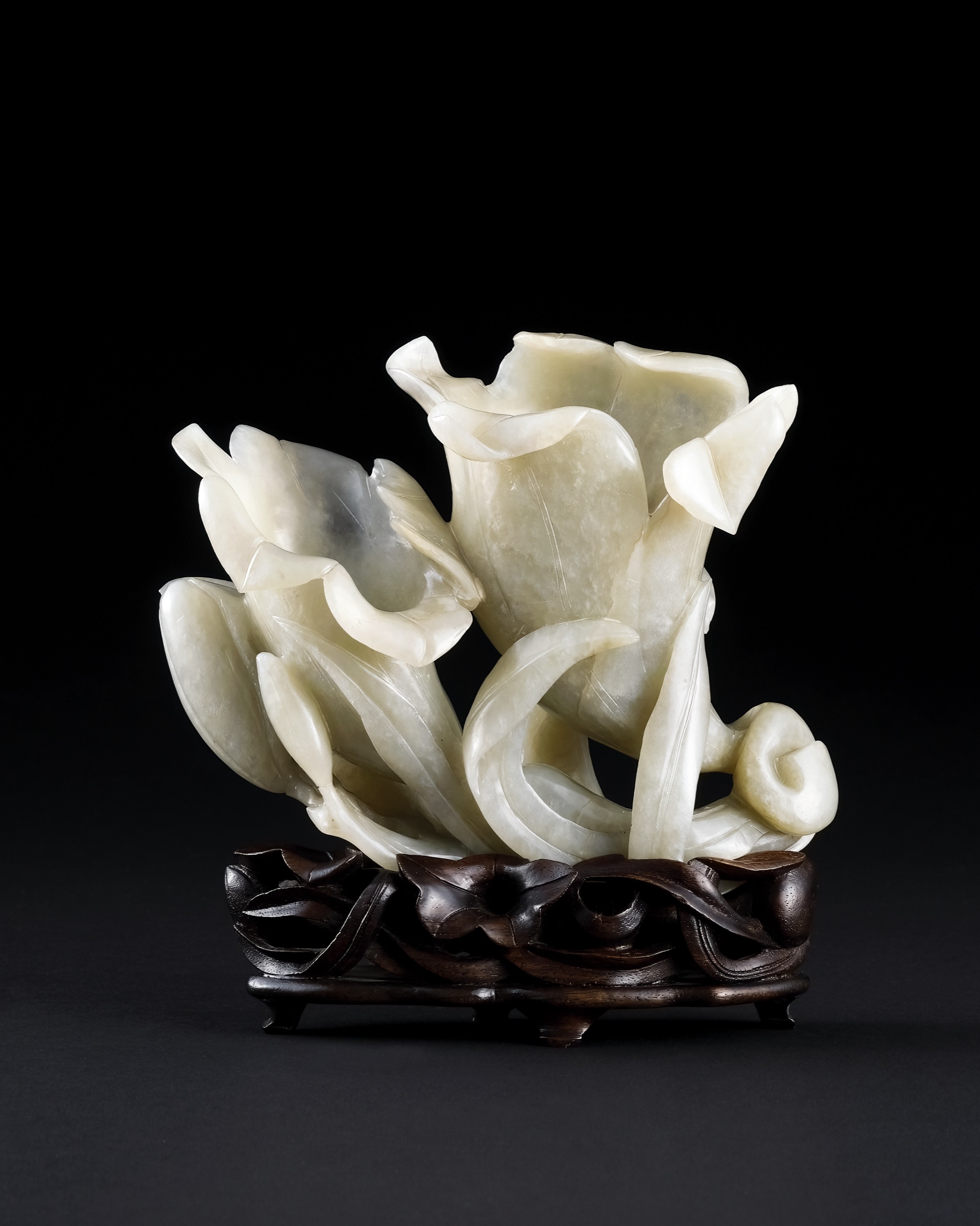 此件白玉花插,以兩株玉蘭花為主體雕飾,花朵半開盛放,瓣片向外舒展,邊緣起伏捲曲,線條柔和而具韻律。花瓣略呈橢圓,表面光潔細潤,中央略凹,葉脈以陰刻技法表現,清晰可見。枝葉於花間蜿蜒穿插,葉片寬闊捲曲,轉折過渡自然,觀之有柔中帶剛。所配老木座,亦雕刻以卷葉與花苞紋飾,構圖相呼應,整體比例協調,意境恬淡。