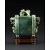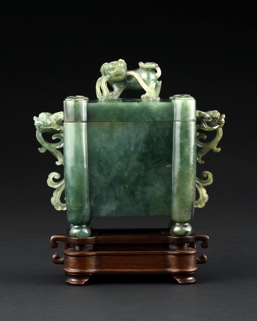 四足蓋爐以整料翡翠雕琢而成,色澤深碧中透深褐斑,局部泛出油潤光澤,質地厚重沉穩,觀之如沉璧古翠,別具韻味。器制取法古彝,通體呈方形立體構造,爐體四角作管柱式設計,挺拔厚實,簡勁古雅。