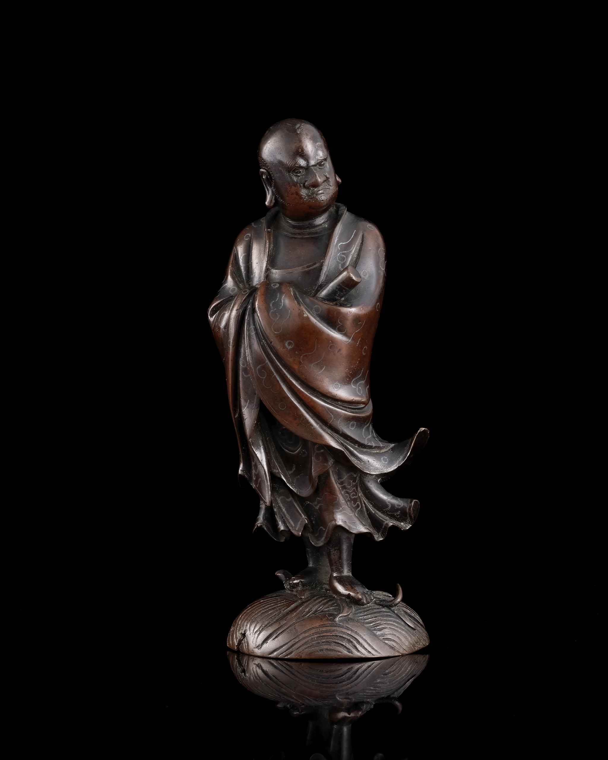 此尊銅雕菩提達摩立像,形神兼備,氣韻非凡。達摩面容方闊,五官深刻有力,雙眉緊蹙,雙目炯然,傳達出堅定果決之氣勢,展現宗祖獨立不羈、破迷啟悟之精神。頭部微側,神情沉思,神韻深遠。身披袈裟,衣襬翻捲生動,衣緣以銀絲嵌飾卷雲紋,細緻典雅,富有動勢。雙臂交叉於胸前,氣度自若,雙足立於波紋起伏之蓮座上,步履穩健,宛如乘波遠行。整體線條簡練有力,銅質沉穩,銀絲錯工精細,為表現禪宗精神之佳作。
