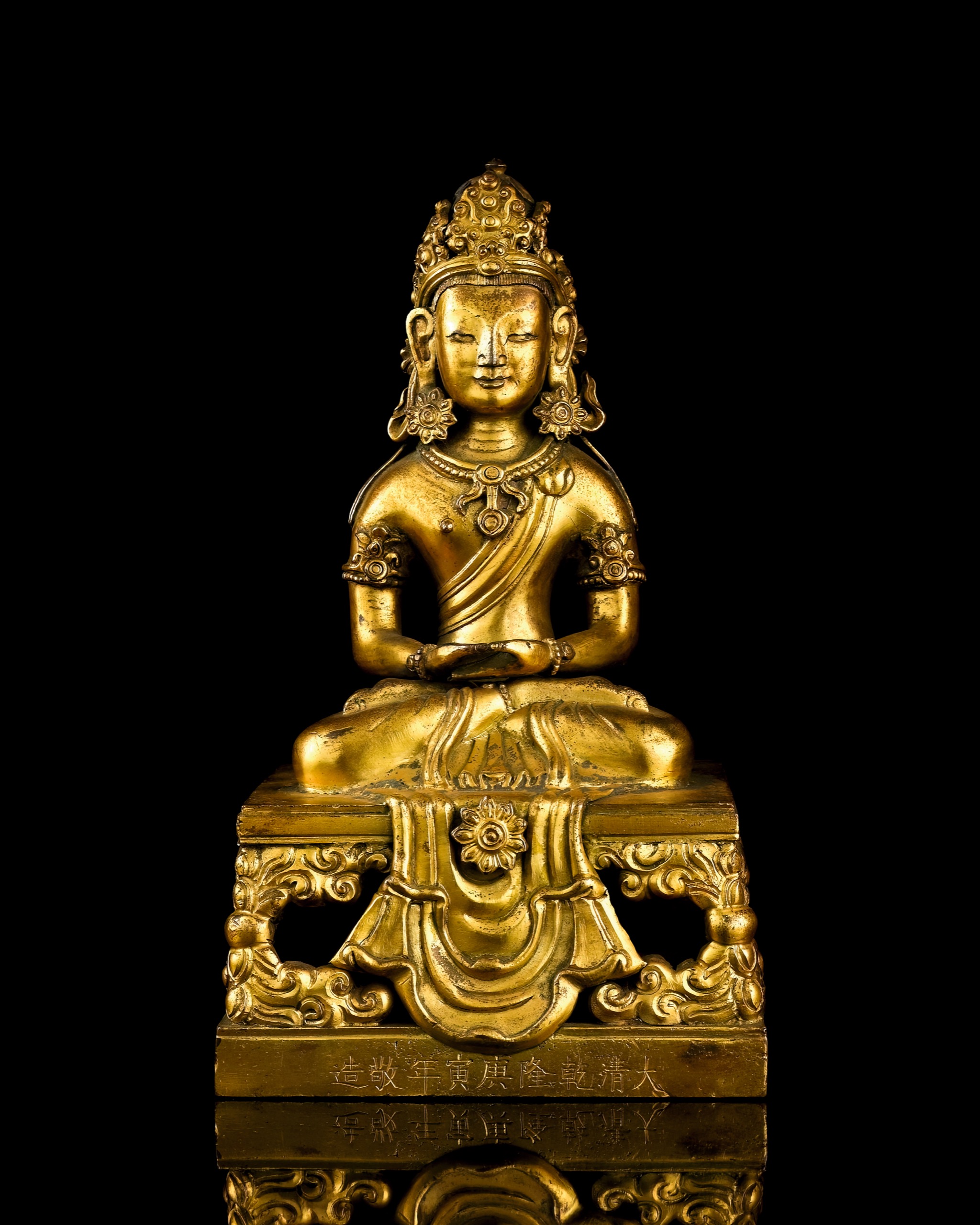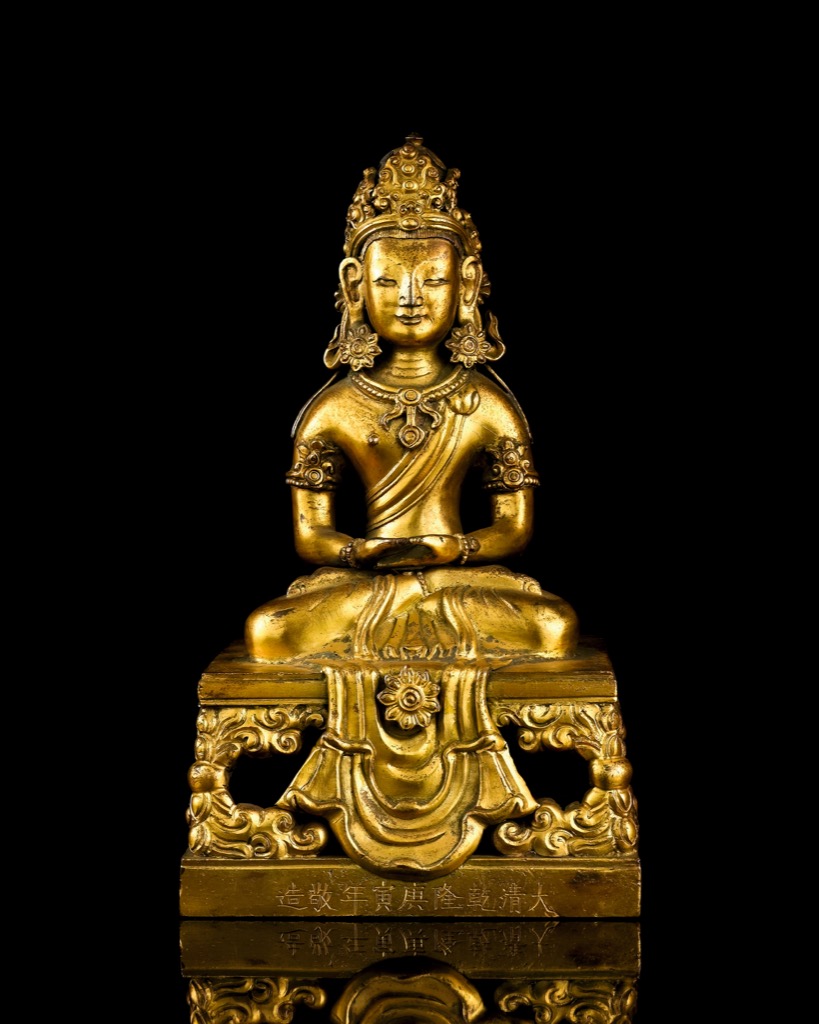 座身四面起框開光,四角飾以蓮花形立柱,結構嚴謹穩固,裝飾簡潔典雅,氣韻恬靜。須彌座前沿鏨刻楷書款識:「大清乾隆庚寅年敬造」,為典型乾隆三十五年(1770),宮廷造辦處為慶賀乾隆皇帝六旬萬壽節所定作。