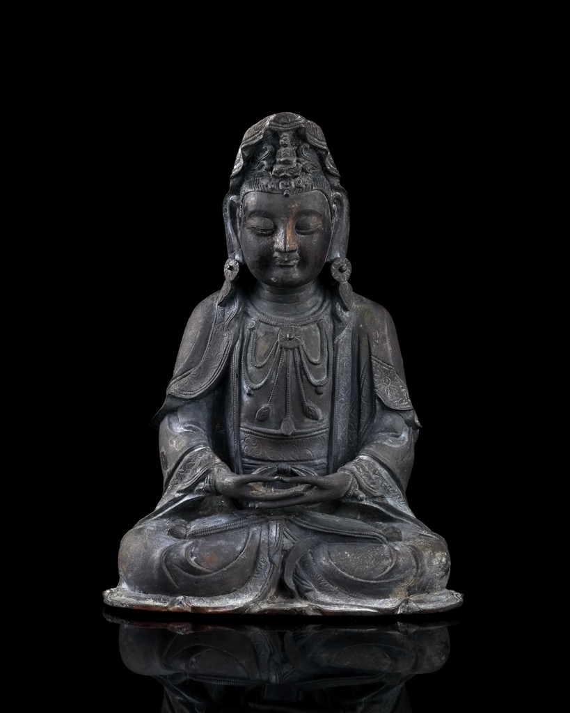 觀音菩薩,寶相莊嚴,面容圓潤慈和,雙目微闔,唇角含笑,頭戴風帽高冠,冠前浮雕化佛,現安詳靜穆之相。雙手於腹前結禪定印,結跏趺坐於仰覆蓮座之上,衣紋自然垂墜,衣緣錾刻花卉紋飾,線條細密流暢,工藝精緻。