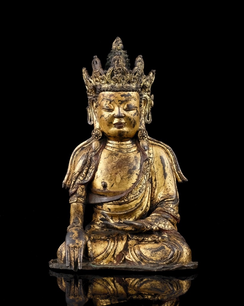 首頁 拍品總覽 2025秋季 share Lot. 1080 明 銅漆金寶冠釋迦牟尼 NT$ 120,000-160,000RMB¥ 24,000-32,000HK$ 30,000-40,000 媒材/尺寸 H25cm 來源 清心堂珍藏,編號96 賞析 本尊釋迦牟尼佛,形制端莊,氣韻莊嚴。佛陀面容方圓飽滿,雙目低垂,神情安定,嘴角含笑,流露慈悲攝受之意。頭戴五葉寶冠,冠葉鏤雕精細,冠帶垂肩飄逸,增添莊嚴華貴之姿。上身內著僧祇支,外披袈裟,褶裥自然流暢,衣緣陰刻細密花紋,展現出工藝之講究與莊嚴氣象。佛陀結跏趺坐,右手施觸地印,左手結定印於腹前,姿態沉靜,象徵降伏魔障、證悟菩提之勝境。 登記競投 返回拍品列表 拍品推薦 1028 王壯為刻 "樂在其中"善伯石獸鈕方章 預估價:NT$ 10,000-20,000 2025秋季 1049 清 琥珀手串 預估價:NT$ 100,000-150,000 2025秋季 1086 尼泊爾 17世紀 銅鎏金勝樂金剛 預估價:NT$ 1,200,000-1,800,000 2025秋季 1101 清乾隆 白玉光素蓋碗 預估價:NT$ 1,200,000-2,000,000 2025秋季 1003 民初 陽羨茗壺岩如款內紫外紅茄段壺 預估價:NT$ 10,000-20,000 2025秋季 1079 明 銅雕風帽觀音 預估價:NT$ 200,000-300,000 2025秋季 1029 王壯為刻 "牛罵頭趙"善伯石獸鈕方章 預估價:NT$ 40,000-60,000 2025秋季 1065 翡翠螭龍福瓜墬 預估價:NT$ 120,000-160,000 2025秋季 1094 石農刻 壽山芙蓉石太獅少獅鈕方章 等 四件一組 預估價:NT$ 150,000-250,000 2025秋季 1007 清中期 菊軒款朱泥蓮子壺 預估價:NT$ 350,000-500,000 2025秋季