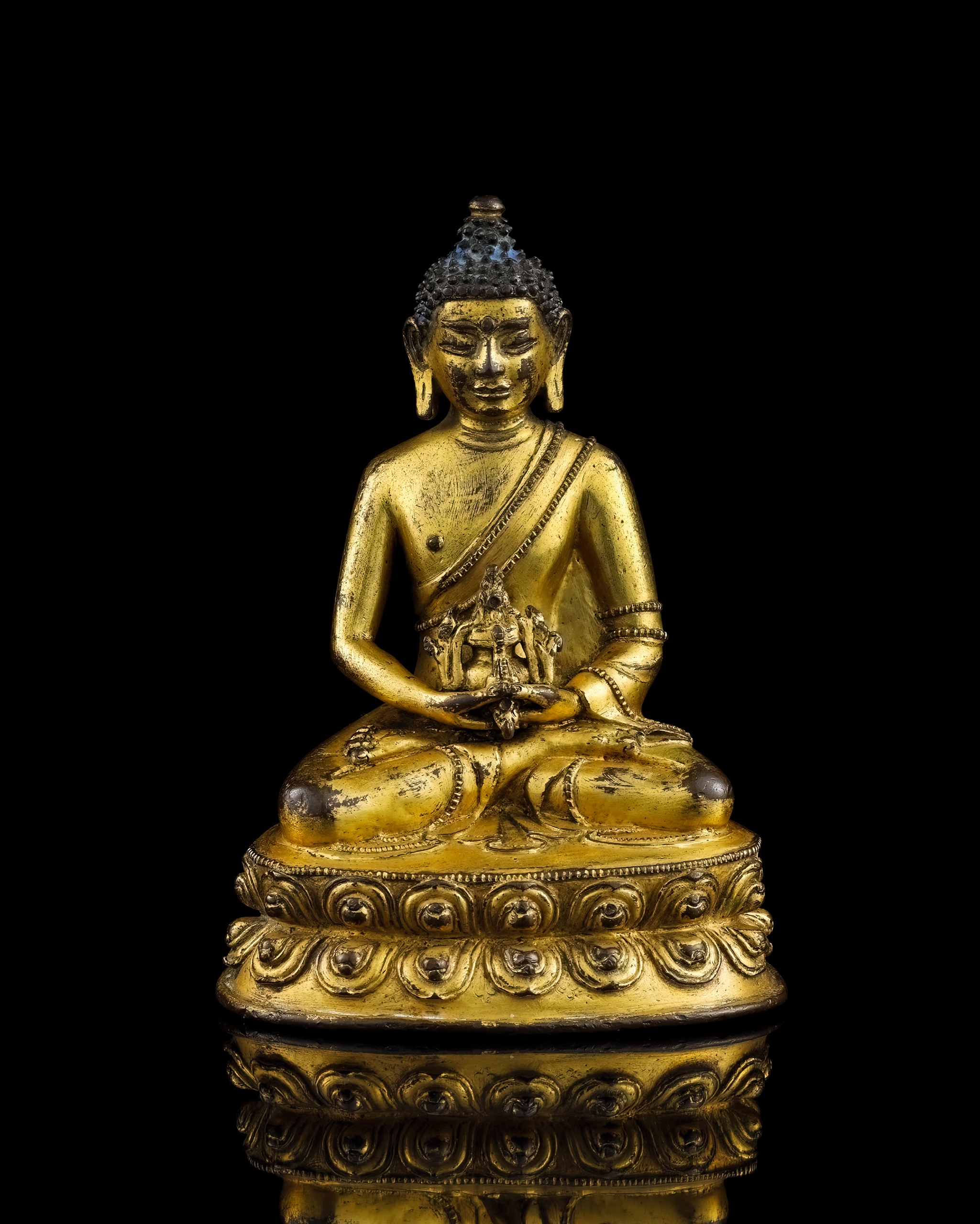 此尊阿彌陀佛造像,法相莊嚴,眉眼舒展,目光微闔,神情澄靜安然,流露內證禪悅之妙境。螺髮緊密層疊,肉髻高聳,頂飾螺形寶珠,耳垂自然下貼,氣度從容穩重。上身袒右著袈裟,衣緣鏨刻纖細勻稱,衣褶隨體態自然垂落,線條流暢而富彈性,展現銅鎏金工藝對衣紋律動之細膩掌握。雙足結跏趺坐於仰覆式雙層蓮座之上,蓮瓣層次分明,飽滿挺秀,穩健而富裝飾美感。
