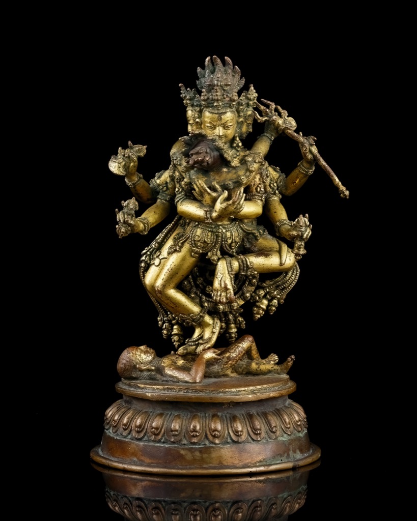 此尊尼泊爾十六世紀銅鎏金勝樂金剛像,依據《勝樂金剛根本續》儀軌造像,呈三面六臂雙身合抱之經典姿態。佛父神情剛猛威烈,髮髻高聳火焰翻卷,髮束間嵌飾十字金剛杵,象徵五智圓融、空性不壞。三面六目神態各異,面貌深邃立體,目光微垂,顯現內觀無分別智之寧定。佛母雙臂纏繞佛父,合頸交眉,神情安詳柔和,五官清麗,展現密乘雙運中之柔性智慧。