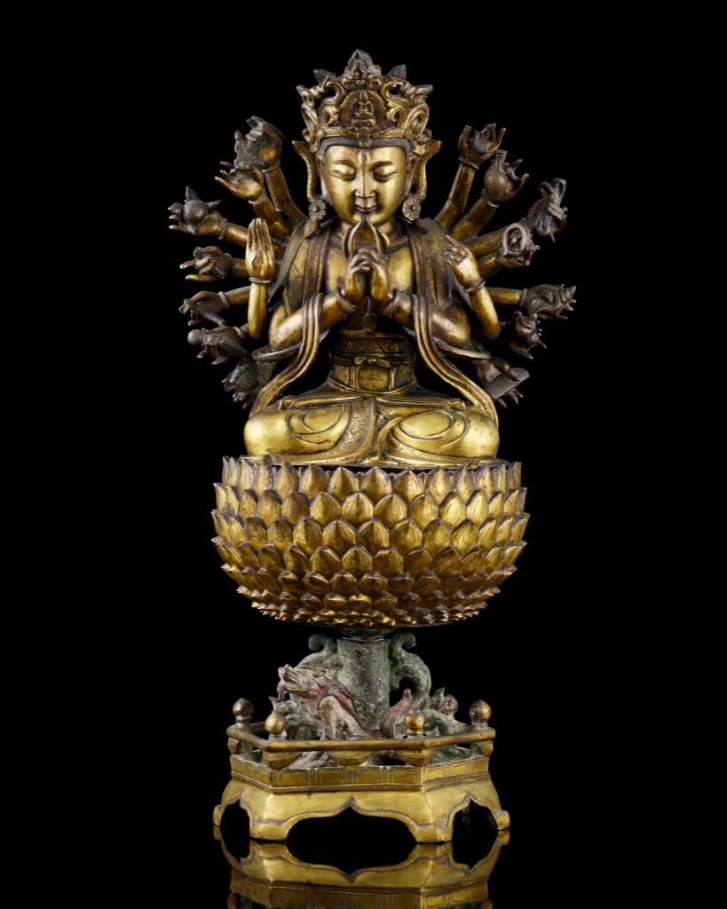 此尊明代銅鎏金準提佛母造像,結跏趺安坐於盛開仰覆蓮台之上,蓮瓣層層堆疊,瓣尖挺拔勻稱,蓮莖化柱,托起整體寶座。蓮台之下承以仿木構圓柱與欄杆式基座,基座飾瑞獸振鬃張口,形神生動,威儀具足,增添整體莊嚴氣象。