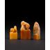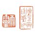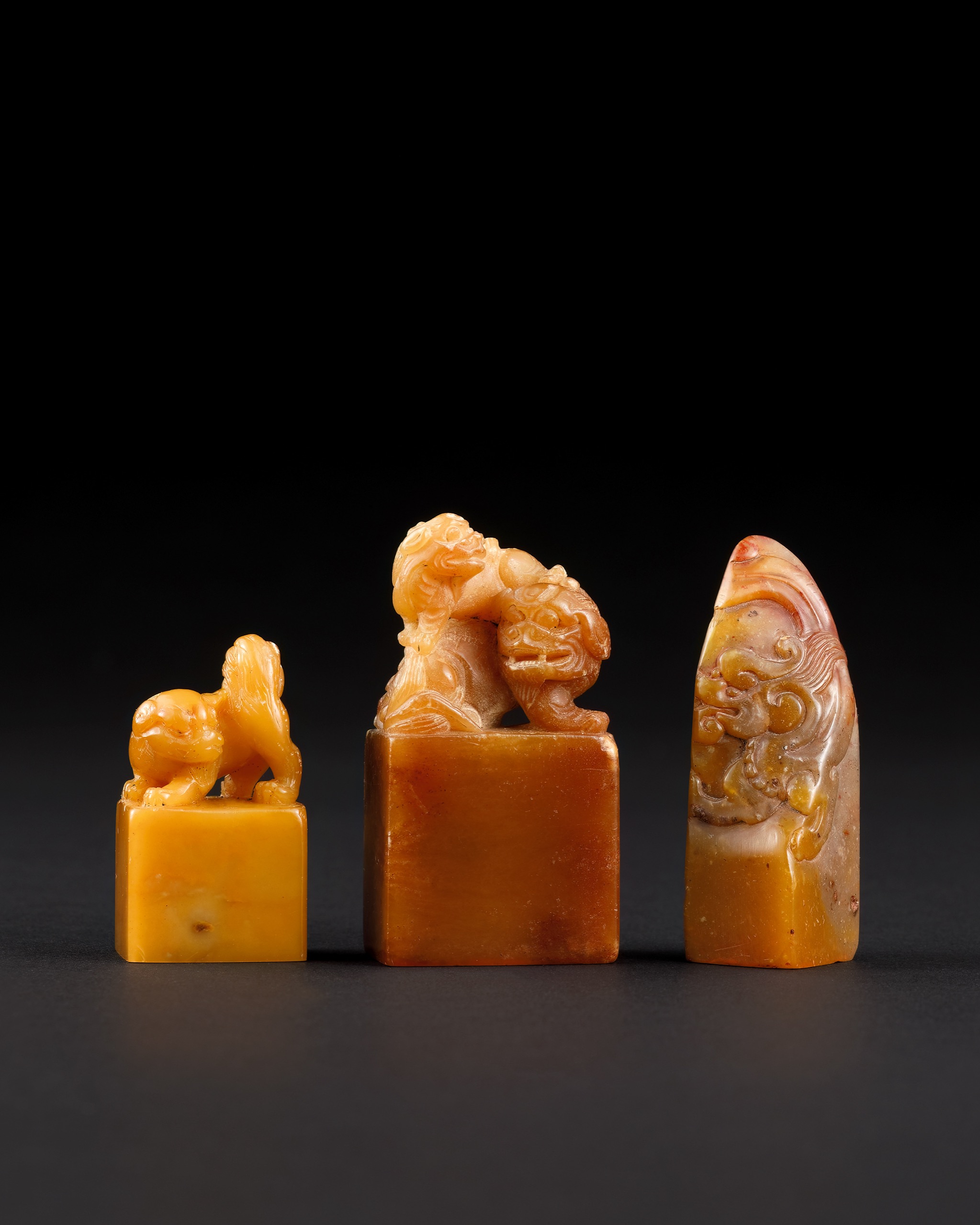 另外兩方分別為,黃壽山太師少師鈕方章,印文〈陳巨齋珍藏印〉,獸鈕身體與鬃毛線條刻簡潔,姿態緊湊,形象可愛。以及一件黃壽山石獸鈕印材,石色偏黃橙,質地細潤,鈕部圓雕一獸,形象生動。