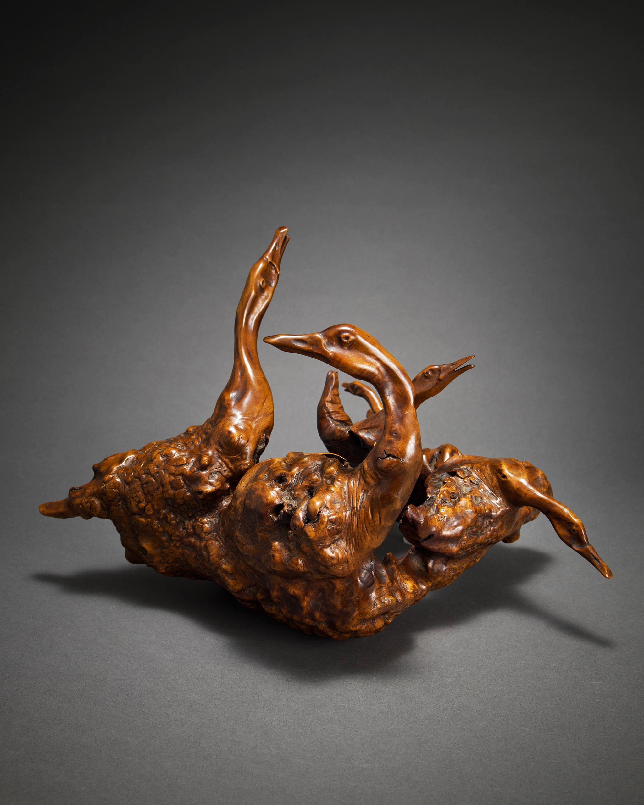 「鵝」在中國文化中象徵高潔與忠誠,古人尤喜以鵝為書齋伴侶,陶淵明「歸鵝」之詩、王羲之「愛鵝好書」之事,皆寄託文人對自然與性靈之嚮往。此件根雕鵝群題材,巧妙結合象徵與寫實,融匯吉祥寓意與自然造形,體現古代文人對自然情趣之投射與情感抒發。