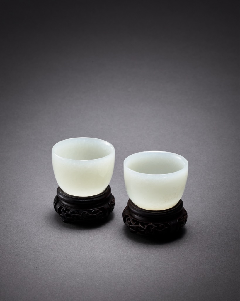 此對酒鍾構造清簡嚴整,用料講究,製作規矩,既見玉工之精細,也與清代內廷尚素之審美趨勢相契合,實為宮廷酒器中素雅端麗之代表,展現乾隆盛世玉器一絲不苟之氣度與規制之美。