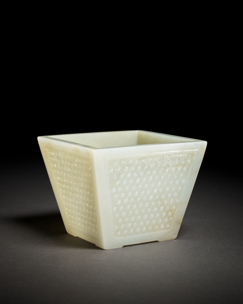 整體造型取意於古代量器「方斗」,形制方整端嚴,口沿平直,口闊底收,壁厚勻稱,外輪廓微外張而不張揚,四面對稱,轉角明快,下承斜撇短足,設計簡潔穩固。古人曰:「十升為一斗,十斗為一石」,斗本為度量五穀之器,亦為禮制象徵,後世引申為各式盛器之通稱。明嘉靖時期,景德鎮御窯場即燒造仿斗式之方杯,其形制延續至清代不墜。本件即承斯制,由陶轉玉,風格更見雍容內斂,別具文房清供之雅趣。