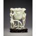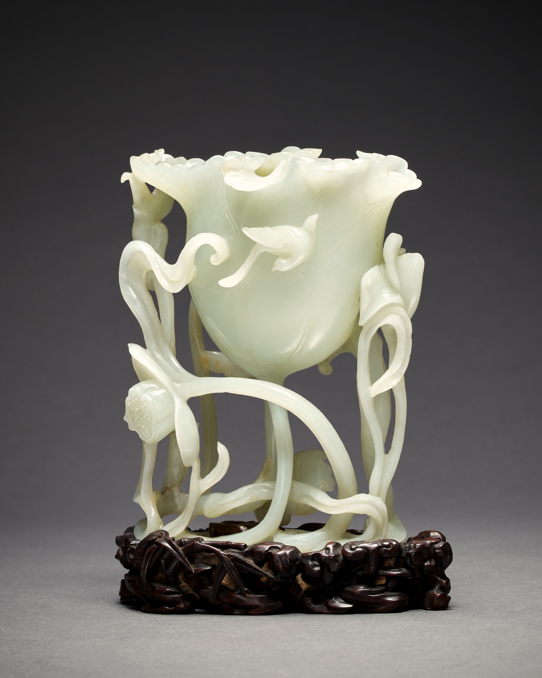 器形構思精妙,主體為一朵盛放荷葉,構成杯形主結構,自下而上漸次敞展,口沿翻卷起伏,若迎風微捲之態。葉面微隆,葉脈以細線薄意刻劃,層層節理井然,將玉質之潤與色之清映襯得更見典雅。荷杯四周以蓮莖盤繞交織而成支撐,莖葉或挺直而上,或前探後盤,錯落有致,宛若荷塘中莖葉穿水而生。其間綴以含苞蓮蕾、漸熟蓮蓬與茨菰等水生植物,枝幹以圓雕立體呈現,葉片則鏤空雕出,邊緣翻卷自然,刻畫出碧波蕩漾、荷葉搖曳之意境。構圖繁密而疏朗,空靈有致,充滿自然寫生之趣。