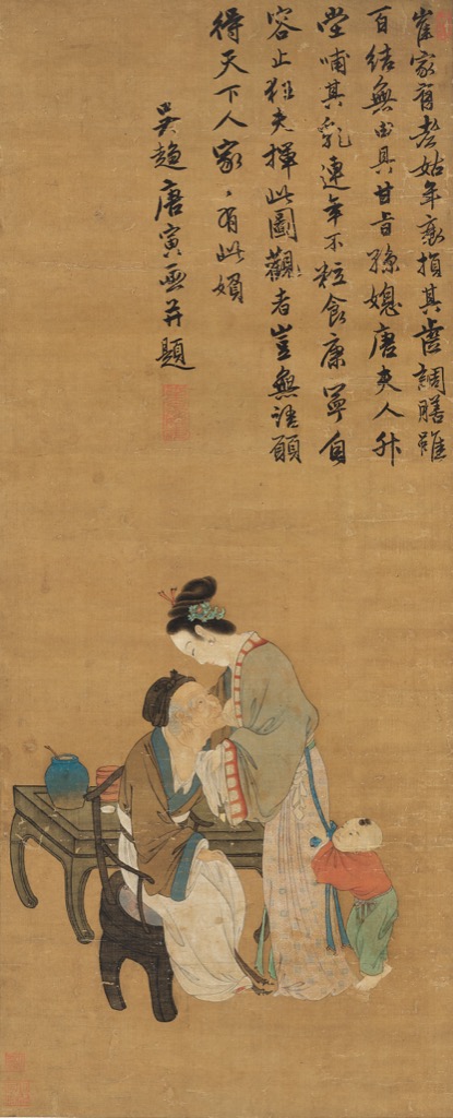 立軸展開,絹色溫潤。明代風流才子唐伯虎(1470–1524)以《崔家孝媳圖》為題,乳汁哺姑的倫理圖像,繪寫一段驚世卻深情的孝行傳奇。畫面中央,年邁齒落的崔家老姑倚坐榻上,孫媳唐夫人解衣哺乳,姿態坦然莊重;背景簡淡,僅以屏風、几案點景,將視覺焦點凝聚於人物之間的動作與神情。老姑面容枯槁卻寧和,少婦低眉垂目,無絲毫扭捏,唯有溫煦靜穆之氣充盈畫間。
