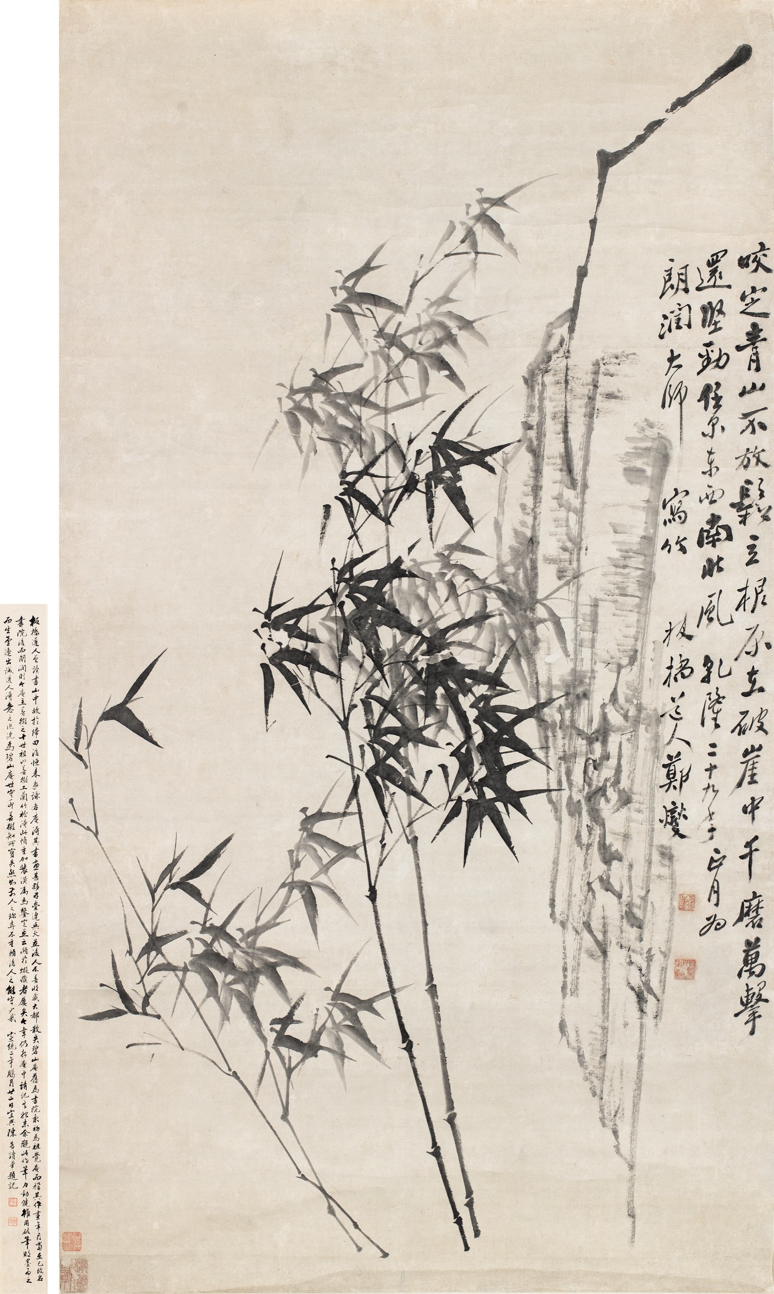 鄭板橋認為竹、石皆有堅固不移之氣節,與其脾性契合,物我交融,曾言「四時不謝之蘭,百節長青之竹,萬古不敗之石,千秋不變之人。」並有感慨:「非唯我愛竹石,即竹石亦愛我也。」此幅創作於「乾隆二十九年正月」(1764年),時鄭板橋已歸老揚州,藝術臻於化境。古稀之年的鄭板橋,繪竹石之術更是愈發勁利,實可謂人愈老,竹愈直,石愈峭。他以最膾炙人口的〈竹石〉詩題畫,贈予焦山碧山庵的「朗潤大師」。詩中「咬定青山」、「立根破巖」的意象,與畫中瘦直勁挺的竹竿、如刀劈斧削的石壁完美互文。墨竹枝葉以「个」字、「介」字法疊加,濃淡乾濕一氣呵成,在筆墨間,迸發出倔強不屈的生命力。亦是詩畫合鳴,風骨精神的不朽銘刻。更是板橋一生孤高剛正人格的終極寫照,是其藝術精神最純粹、最強烈的表達。