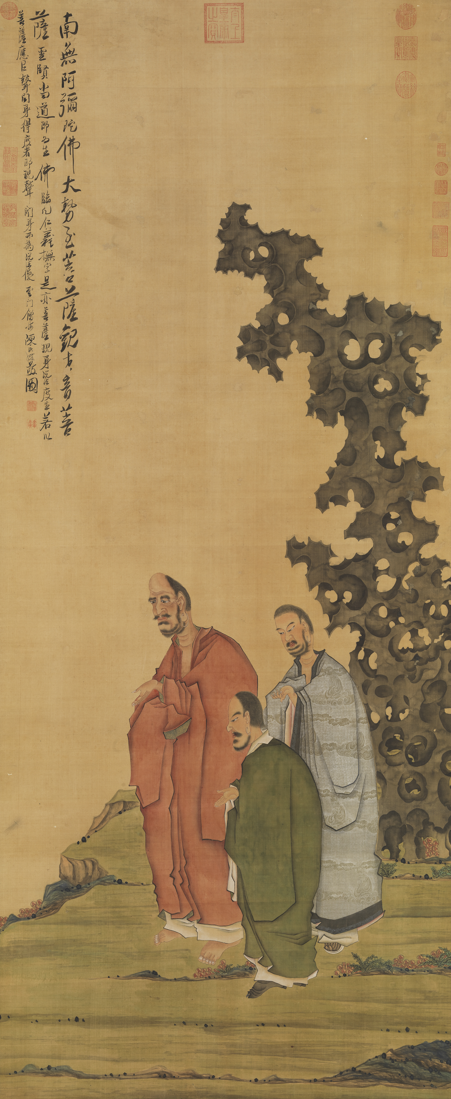 當奇崛高古的線條不再描繪狷狂的世相,而轉向內心的佛前燈火時,我們看見的,是一個晚明變形主義大師陳洪綬極罕見的佛畫——《雲門僧說法圖》。此軸為市場稀見之寶,其「一僧二居士」的經典構圖,更與臺北故宮所藏陳洪綬《蓮池應化圖》形成雙璧輝映,為解讀老蓮晚年藝術與精神轉向,提供了無可替代的關鍵實證。