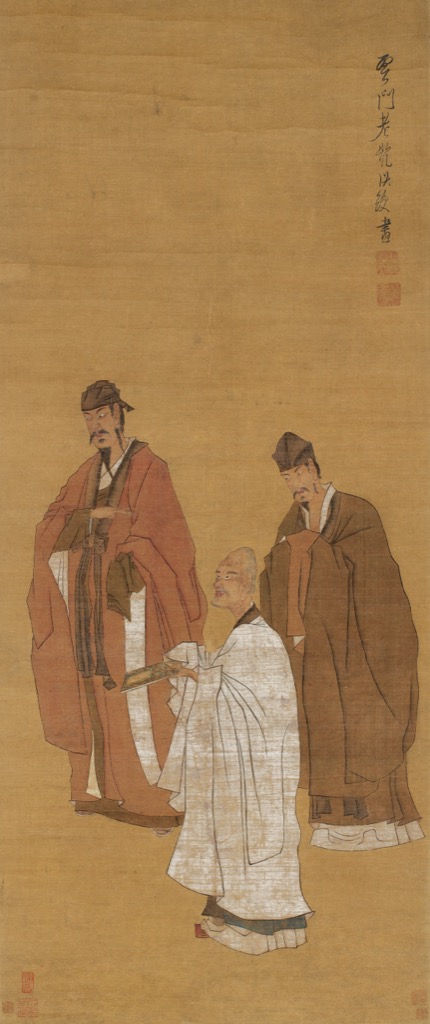 陳洪綬的「高古奇崛」,在此畫中洗盡鉛華,歸於凝練。畫中三位人物,高頭大馬,其造形怪異,頭和身體不成比例,人物衣紋線條轉折方勁,如屈鐵盤絲,賦予形象如金石般的立體永恆感。這種刻意為之的「變形」與「古拙」,而是禪心剝離世俗樣貌,直取人物內在風骨與神韻。設色古雅,以墨為主,輔以淡赭,營造出蕭散寂寥的方外之境。筆墨與主題在此達成高度統一,每一根線條都彷彿是畫家持戒修行的心跡流露。