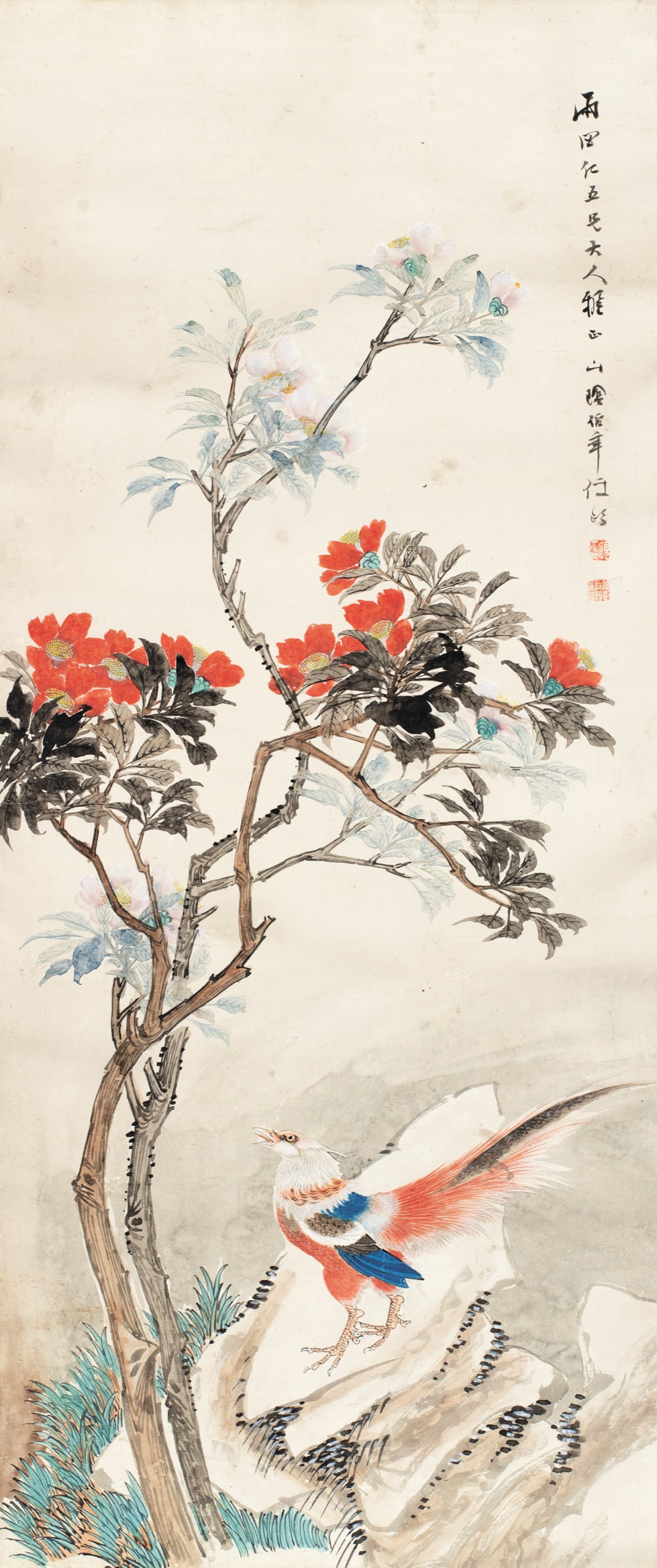 本幅《茶花錦雞圖軸》盡顯任氏花鳥畫之筆墨匠心全能功力:
