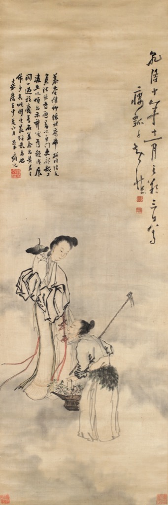 黃慎乃「揚州八怪」中以人物畫享譽最高者,其最大創造在於將狂草書法筆意熔鑄於人物線條之中。此幅繪持荷仕女與攜籃侍女,題材看似尋常,卻盡顯其過人膽識。人物衣紋勾勒如筆走龍蛇,線條頓挫疾徐,充滿草書般的節奏與張力。仕女面容清奇,姿態嫻雅,於狂放筆墨中透出高古之氣;侍女持鋤提籃,籃中花草點綴,平添生趣,兩位人物置身於雲霧中,在虛實相映間,仿若仙