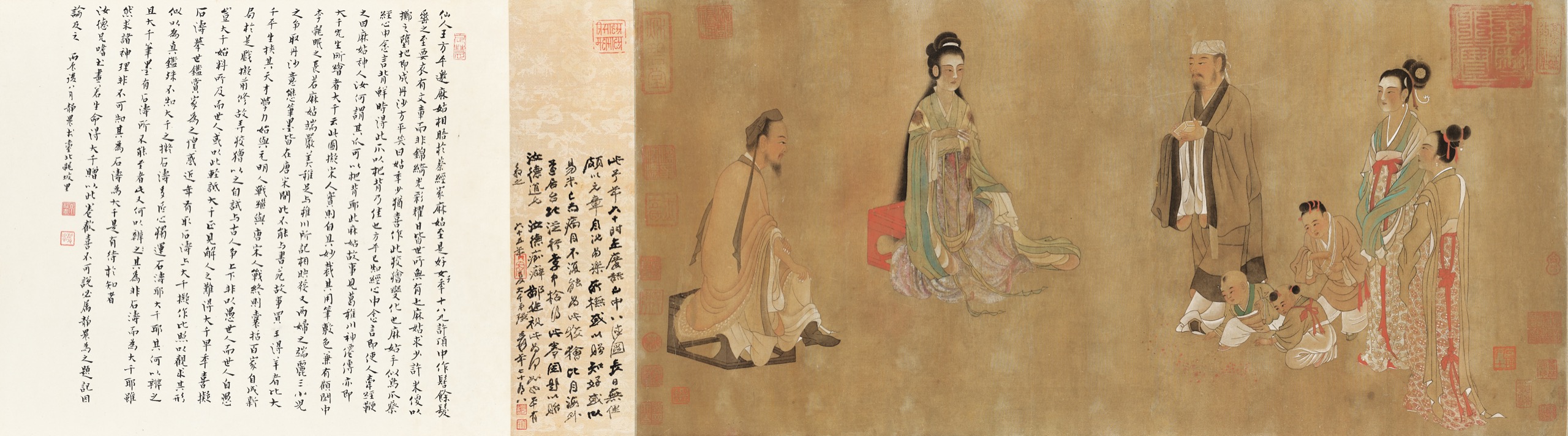 臺靜農題跋:仙人王方平邀麻姑相晤於蔡經家,麻姑至是好女子,年十八九許,頂中作髻,餘髮垂之至要,衣有文章。而非錦綺。光彩耀日。皆世所無有也。麻姑求少許米。便以擲之。墮地即成丹沙。方平笑曰。姑年少。猶喜作此狡獪變化也。麻姑手似鳥爪。蔡經心中念言。背蛘時。得此爪以杷背。乃佳也。方平已知經心中念言。即使人牽經鞭之。曰。麻姑者神人。汝何忽謂其爪可以杷背耶。此麻姑故事見葛稚川神仙傳亦即,大千先生所繪者,大千云,此圖擬宋人實則自具妙裁,其用筆敷色兼有顧閎中、李龍眠之長,若麻姑端嚴美稚,足與稚川所記相照映發。又兩婦之端麗三小兒之爭取丹沙意態,筆墨皆在唐宋間,此不能與書苑故事買羊得羊者比,大千平生挾其天才學力始與元明人戰繼與唐宋人戰終則囊括百家,自成新局,於是戲擬前修故弄狡獪,以之自試與搶人爭上下,非以愚世人而自愚,豈大千始料所及,而世人或以此輕詆大千正,見解人之難得大千早年喜擬石濤舉世鑑賞家為之惶惑,近年有取石濤與大千擬作,比照以觀求其形,似以為真鑑,殊不知大千之擬石濤多匠心獨運石濤耶、大千耶,其何以辨之。且大千筆墨有石濤所不能至者,此又何辨,其為非石濤而為大千耶,雖然求諸神理,非不可知其為石濤,為大千是有待於知者。汝德兄嗜書畫若生命得大千贈以卷歡喜不可說,必屬靜農為之題記,因論及之。丙辰後八月靜農於臺北龍坡里。鈐印:定慧、臺靜農,靜者。 -