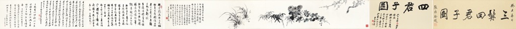 張大千、鄭曼青、劉延濤三髯合作四君子手卷,前雙引首由張維翰、張大千所題,其後由壬子鄭曼青題跋、癸丑時王壯為題跋、甲寅時請臺靜農題跋,陳定山八十六歲時為其題跋。本卷之完成歷經數年且從美國訪大千畫菊後,劉延濤畫雙墨蘭、復請鄭曼青畫梅竹,後請王壯為、臺靜農、陳定山題跋記此因緣。 -