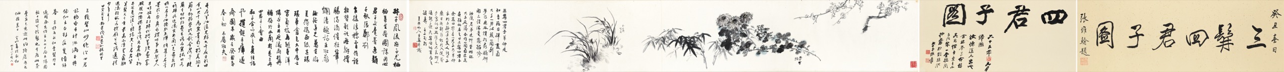 張大千、鄭曼青、劉延濤三髯合作四君子手卷,前雙引首由張維翰、張大千所題,其後由壬子鄭曼青題跋、癸丑時王壯為題跋、甲寅時請臺靜農題跋,陳定山八十六歲時為其題跋。本卷之完成歷經數年且從美國訪大千畫菊後,劉延濤畫雙墨蘭、復請鄭曼青畫梅竹,後請王壯為、臺靜農、陳定山題跋記此因緣。