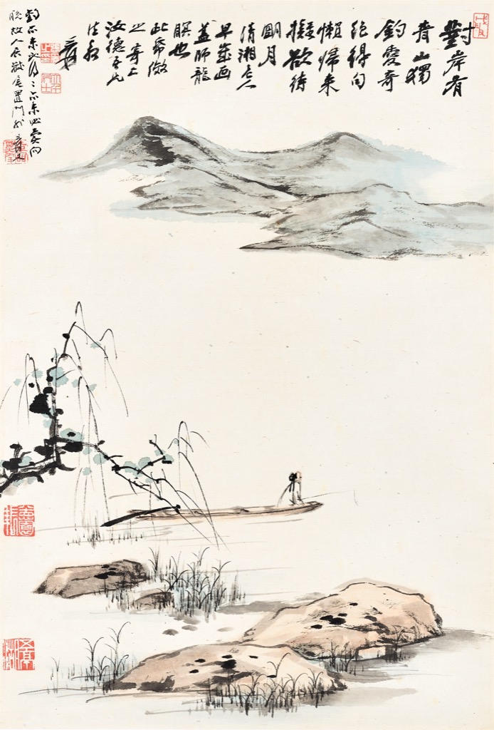 畫面意境亦盡得石濤神髓。近景高士獨坐孤舟,持竿臨水,線條簡澹高古,姿態含蓄而自足,透出「獨釣愛奇絕」的孤傲與專注。中景湖水以虛白處理,煙波浩渺,留白之處彷彿暗藏氣息流轉;遠岸青山一痕,若有若無,既遠且淡。全圖構圖疏朗而不疏漏,花青墨色清潤相生,將石濤筆下那種脫略形跡、直抒性靈的逸氣,化為大千自身的沉著氣度與澄明胸次。