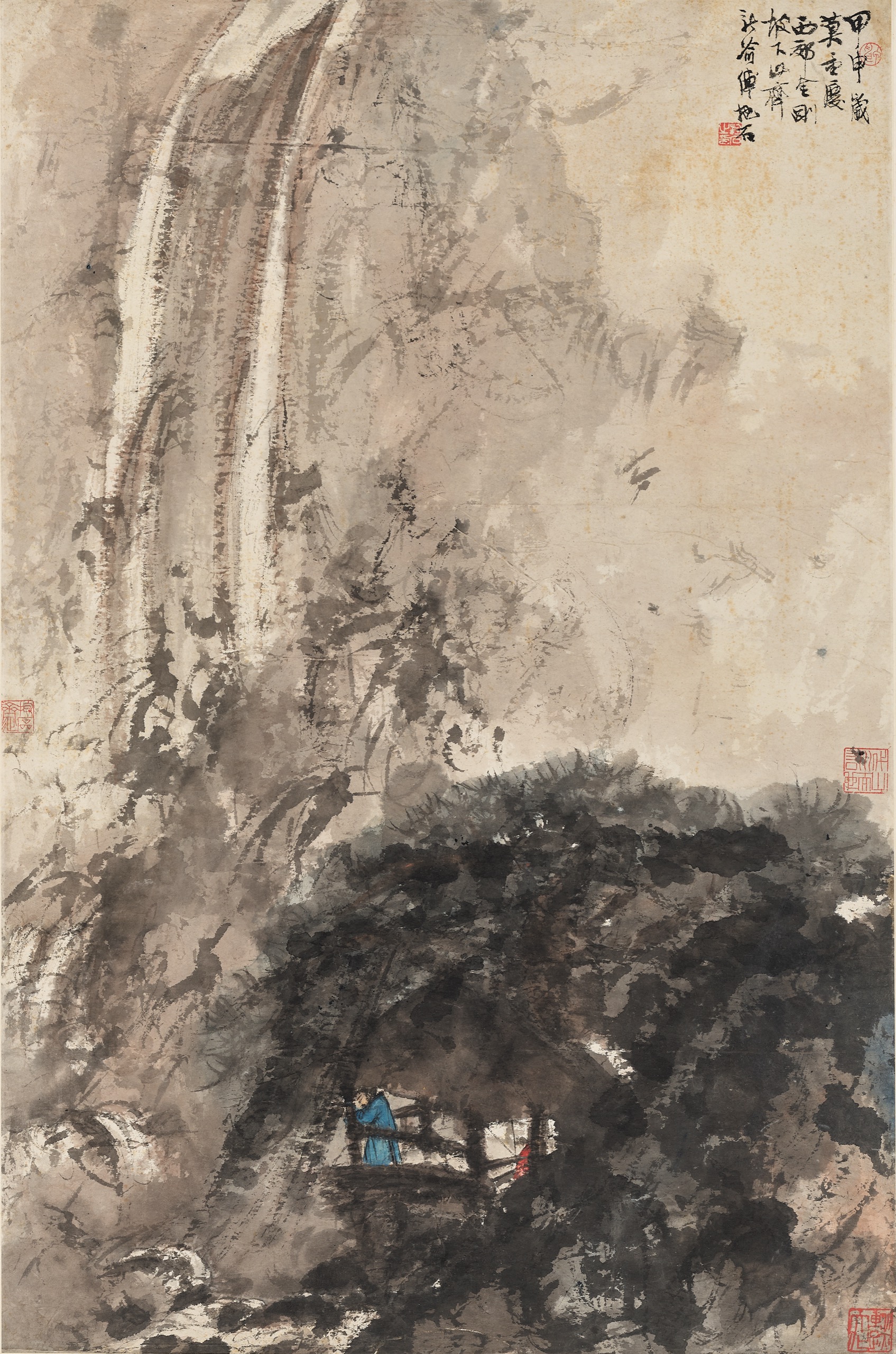 款識「甲申歲莫,重慶西郊金剛坡下山齋,新喻傅抱石」正是傅抱石40歲的創作:1944年歲末,重慶。彼時,抗日戰爭已近尾聲,傅抱石寓居於重慶西郊金剛坡下已近六年。這方狹小簡陋的「山齋」,卻是二十世紀中國畫一場靜默革命的策源地。戰亂的顛沛、家庭的溫暖、巴山夜雨的滋養,以及因資料散佚而轉向筆墨抒懷的境遇,共同催生了傅抱石創作力的總爆發。他曾動情地寫道:「畫山水的在四川若沒有感動,實在辜負了四川的山水。」 《松亭觀泉圖》正是這份「感動」的產物,是畫家將金剛坡周遭「煙籠霧鎖、蒼茫雄奇」的自然景象內化為筆底波瀾的典範。
