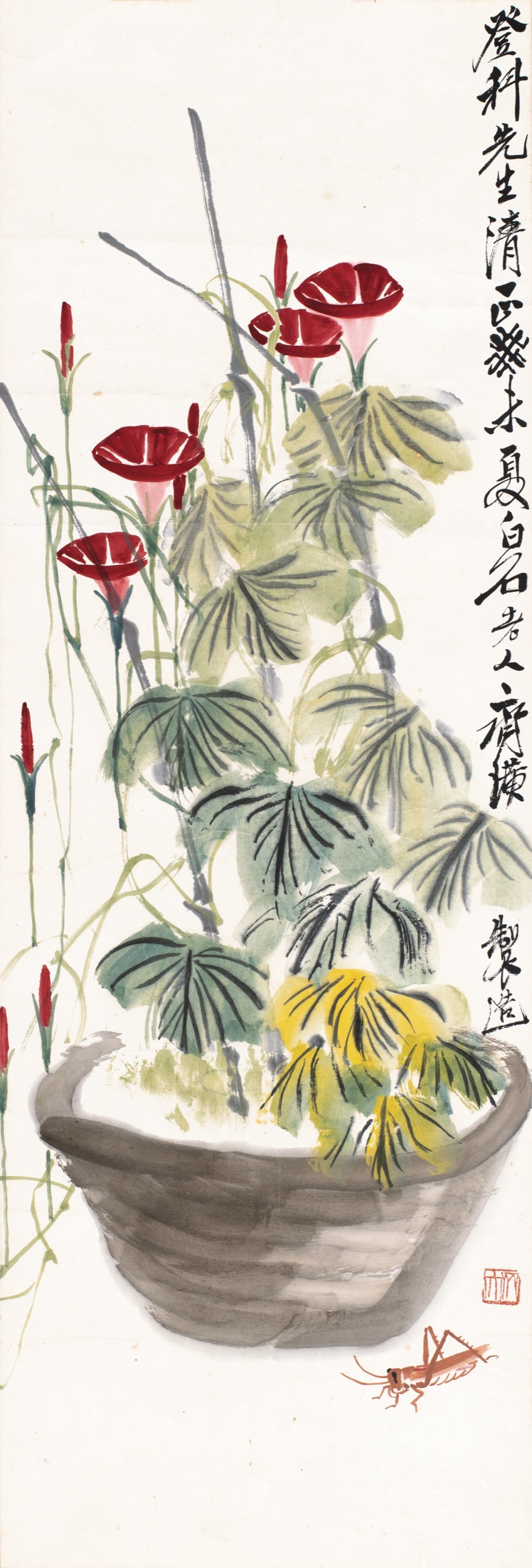 齊白石筆下花卉草蟲,絕非書齋臆想,而是深植于對自然四時秩序與生命節律的忠實觀察與熾熱禮贊。此幅癸未年(1943)夏日為「登科先生」所作《牽牛花與蚱蜢》,時值盛夏,正是牽牛藤蔓滋長、蓄勢待發之際,畫家以此入畫,不僅記錄時令,更寄託了對生命繁榮的由衷詠歎。畫面中,牽牛花非單枝獨秀,而是以「一盆盛放」姿態出現,花朵聚散如錦,藤蔓垂拂洋溢著不受拘束的野逸生機與豐饒之美。這正契合其自然花期綿長、生命力旺盛的特質,畫家捕捉並放大了這份源於精心栽培的牽牛花旺盛活力。