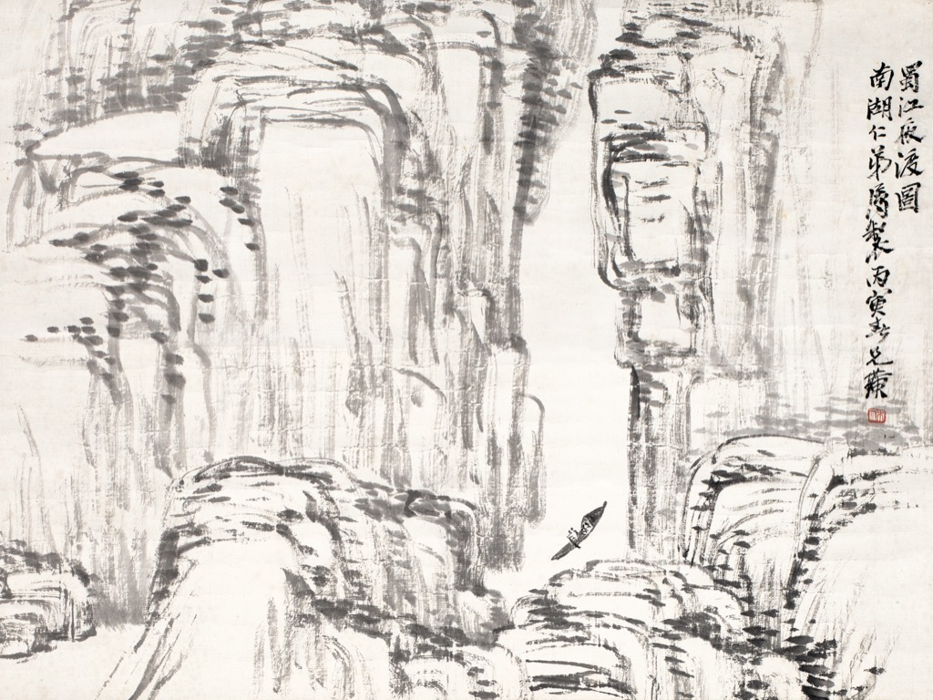 畫面的革命性首先體現在其「空中視角」。齊白石拋棄了一切傳統山水畫的平遠、深遠法則,宛如將觀者置於百丈高空,垂直俯瞰峽江。兩岸峭壁如巨斧劈開天地,自畫面上方壓頂而下,形成極具壓迫感的狹窄通道;一線江流以留白呈現,在濃淡皴筆圍堵中奪路而出。這種極度簡化、幾近抽象的空間處理,江上一孤舟充滿現代形式的張力與孤絕感,是齊白石將木匠的空間洞察力轉化為繪畫語言的巔峰表現,在20世紀中國畫的視覺革命中獨樹一幟。