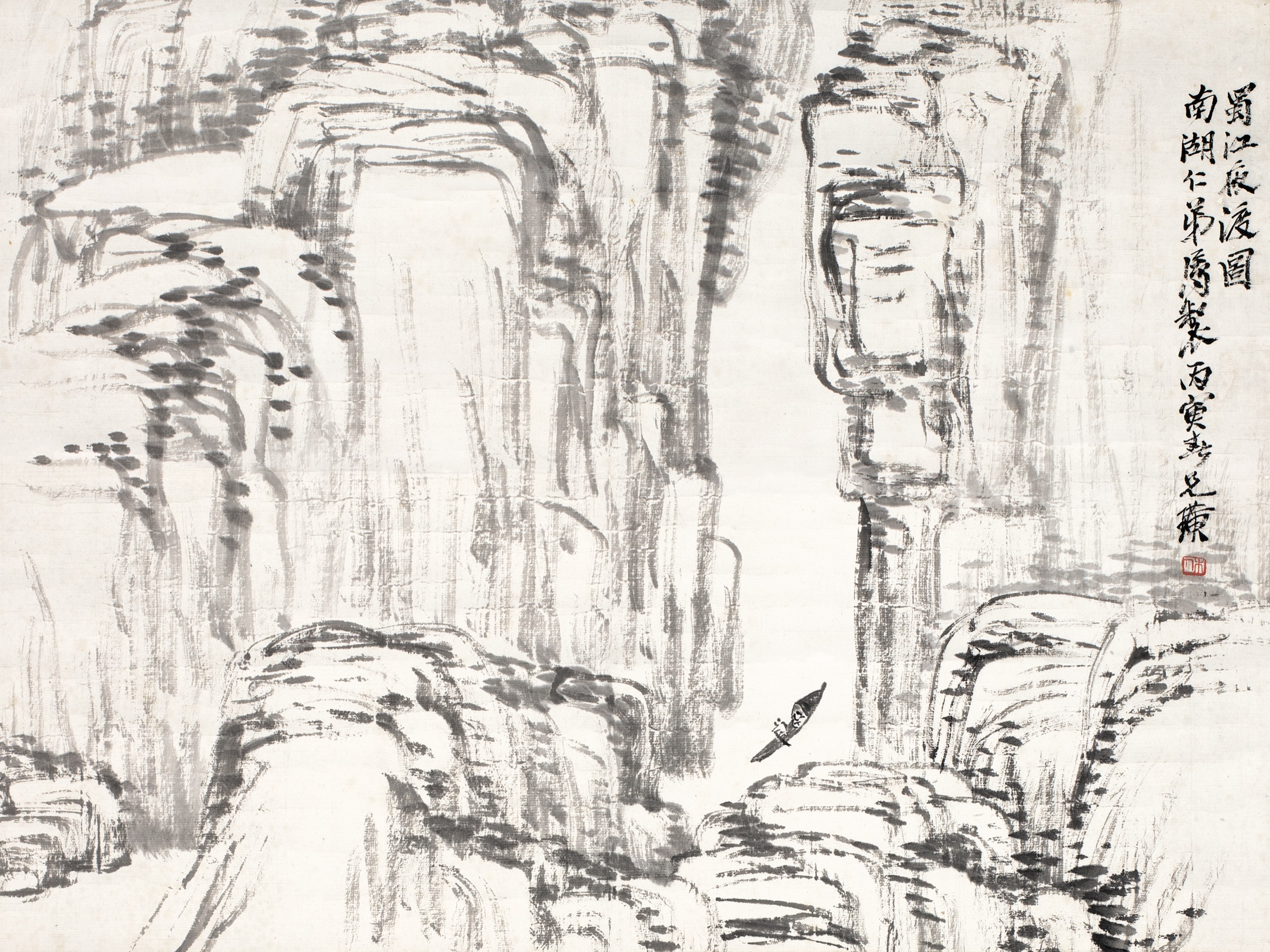 畫題中的「蜀江」,在此既是具體的巴蜀山水,更是一種精神性的地標。蜀道之難,自古象徵著艱險與征途。齊白石以金石般蒼勁的筆法,皴擦出山岩的粗礪與堅實,將蜀江的險峻氣質提煉為純粹的筆墨結構。那峽谷中順流而下的一葉孤舟,於萬仞夾壁間顯得無比渺小,卻又因動勢與留白而充滿生機,完美詮釋了「知其難而為之」的勇氣。