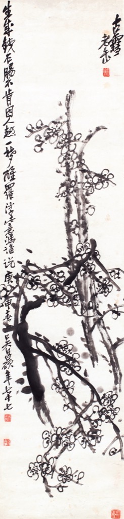 此作傳承有序權威出版著錄於《吳昌碩書畫選》(2000年)、《墨妙-雙石艸堂藏吳昌碩齊白石書畫》(2014年)。吳昌碩晚年梅花題材屢創高價,2023 年香港蘇富比《紅梅圖》以2,160 萬港元成交。此作集詩、書、畫、印「四絕」於一體,兼具文人雅趣與金石力量,堪稱博物館級珍藏品!敬請諸方家多予觀注臺北帝圖藝術拍賣會此件「鐵筆寫乾坤,古雪照丹心」名品。