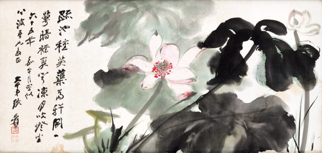 疏池種芙蕖,當軒開一萼。暗襟裏,聞涼月,吹燈坐。六十五年嘉平月,寫似心波吾兄教正,大千弟張爰。