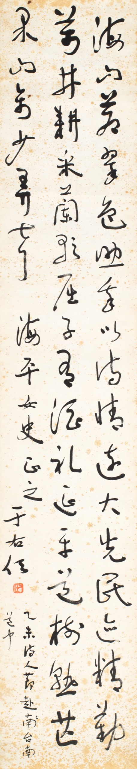 首頁 拍品總覽 2025秋季 share Lot. 3068 于右任Yu You-Ren 1879-1964 海山蒼翠色詩 年代:1955 NT$ 200,000-300,000RMB¥ 40,000-60,000HK$ 50,000-75,000 媒材/尺寸 立軸 水墨 紙本, 138.5x25cm 款識 海山蒼翠色,助我以詩情。遠大先民跡,精勤萬井耕。采蘭歌屈子,有酒禮延平。道樹熟芒果,山禽少弄聲。海平女史正之,乙未詩人節赴台南道中,于右任。 鈐印 右任(朱)。 來源 上款人:許海平女士(即前臺北故宮博物院長秦孝儀夫人)。 出版/備註 秦孝儀院長珍藏專題 登記競投 返回拍品列表 拍品推薦 3195 吳詠香 谷關即景、橫貫公路途中 預估價:NT$ 25,000-40,000 2025秋季 3053 乾隆帝 乾隆御筆耕織詩 預估價:NT$ 2,000,000-3,000,000 2025秋季 3191 吳青霞 鼠趣圖 預估價:NT$ 20,000-30,000 2025秋季 3244 孫雲生 泛舟圖 預估價:NT$ 40,000-60,000 2025秋季 3109 溥心畬 書法條幅 預估價:NT$ 50,000-80,000 2025秋季 3214 陶壽伯 暗香浮動 預估價:NT$ 10,000-20,000 2025秋季 3032 虛谷 桃實八哥圖 預估價:NT$ 600,000-1,200,000 2025秋季 3155 陳半丁 花卉扇面 預估價:NT$ 50,000-80,000 2025秋季 3302 木庵性瑫 草書條幅 預估價:NT$ 100,000-150,000 2025秋季 3219 歐豪年 鹿群 預估價:NT$ 20,000-40,000 2025秋季