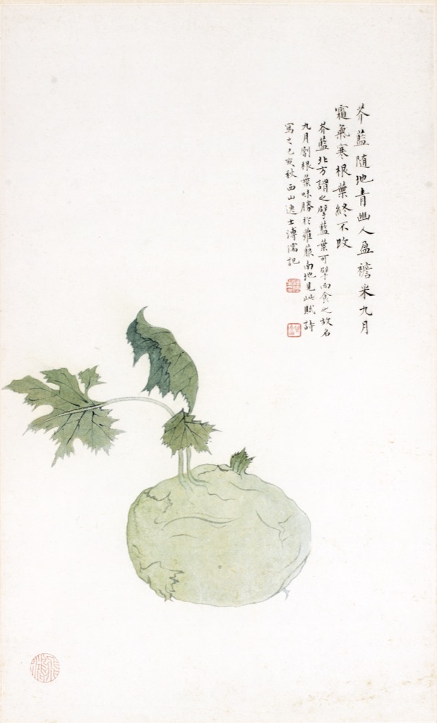 芥藍北方謂之擘藍,葉可擘而食之故名。九月劚根葉,味勝於蘿菔,南地見此,賦詩寫之,己亥秋西山逸士溥儒記。 -