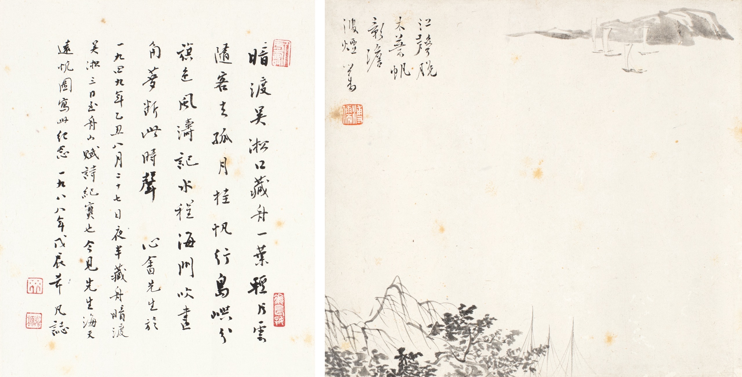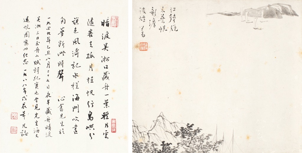江聲脫木葉,帆彰澹波煙。心畬。丁嘉榞題跋:暗渡吳凇口,藏舟一葉輕。片雲隨客去,孤月挂帆行。島嶼分旗色,風濤記水程。海門吹畫角,夢斷此時聲。心畬先生於一九四九年乙(應為己)丑八月二十七日夜半,藏舟暗渡吳凇口至舟山,賦詩紀實也。今見先生海天遠帆圖寫此紀念,一九八八年戊辰,希凡誌。