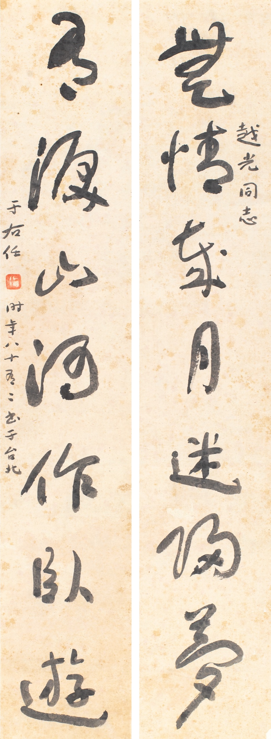 首頁 拍品總覽 2025秋季 share Lot. 3122 于右任Yu You-Ren 1879-1964 草書七言聯 年代:1961 NT$ 150,000-250,000RMB¥ 30,000-50,000HK$ 37,500-62,500 媒材/尺寸 鏡片 水墨 紙本, 89x16cmx2 款識 無情歲月迷歸夢,有淚山河作臥遊。越光同志,于右任時年八十有二書于台北。 鈐印 右任(朱)。 來源 上款人:金越光先生 甄藏拍賣,2002.06.02,Lot.113。 登記競投 返回拍品列表 拍品推薦 3261 臺靜農 行草王維《鳥鳴澗》 預估價:NT$ 100,000-150,000 2025秋季 3017 蔣溥 全家福 預估價:NT$ 200,000-300,000 2025秋季 3231 王文治 書法七言聯 預估價:NT$ 40,000-60,000 2025秋季 3266 于右任 草書《山谷內集詩注》 預估價:NT$ 100,000-150,000 2025秋季 3114 溥心畬(題)、曾其(畫) 紅梅圖 預估價:NT$ 30,000-50,000 2025秋季 3024 黃鼎 萬木奇峰 預估價:NT$ 200,000-300,000 2025秋季 3232 王文治 書法七言聯 預估價:NT$ 50,000-80,000 2025秋季 3290 夏之鼎 午瑞圖 預估價:NT$ 50,000-80,000 2025秋季 3257 匡仲英 花鳥 預估價:NT$ 5,000-10,000 2025秋季 3283 翁同龢、韓宗源 八言聯、祝壽聯(二件一組) 預估價:NT$ 25,000-40,000 2025秋季