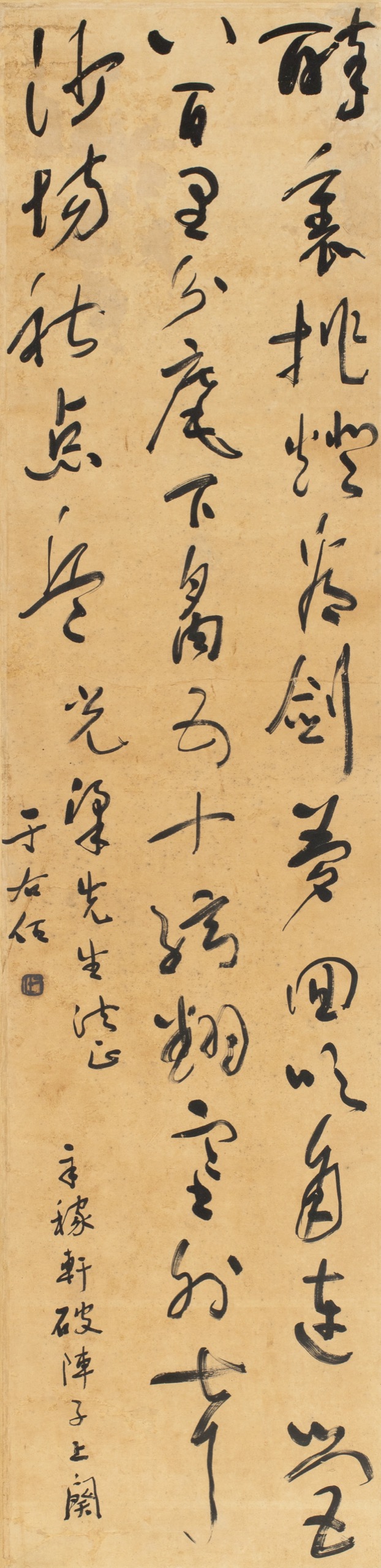 首頁 拍品總覽 2025秋季 share Lot. 3130 于右任Yu You-Ren 1879-1964 書法條幅 NT$ 120,000-180,000RMB¥ 24,000-36,000HK$ 30,000-45,000 媒材/尺寸 鏡框 水墨 紙本, 131x32cm 款識 醉裏挑燈看劍,夢回吹角連營。八百里分麾下炙,五十弦翻塞外聲。沙場秋點兵。辛稼軒破陣子上闕。光梁先生法正,于右任。 鈐印 右任(朱)。 來源 上款人:宋光梁先生。 賞析 宋光梁先生曾於1990至2000年初期,擔任經濟部中央標準局副局長,是中華民國標準檢驗領域的重要官員。 登記競投 返回拍品列表 拍品推薦 3248 周澄 高山遠望圖、青山泛舟圖(二件一組) 預估價:NT$ 30,000-50,000 2025秋季 3041 齊白石 紅荷雙魚 預估價:NT$ 2,000,000-3,000,000 2025秋季 3331 符鐵年 月影橫牕夢不酣 預估價:NT$ 20,000-30,000 2025秋季 3147 三沙漁隱、陳縱才、李啟林、張志瓊、姚冬聲、高逸鴻、梁中銘、梁又銘 書畫(十件一組) 預估價:NT$ 20,000-30,000 2025秋季 3038 傅抱石 松亭觀泉圖 預估價:NT$ 8,000,000-15,000,000 2025秋季 3086 溥心畬 《霜果霧石楷書七言聯》 預估價:NT$ 300,000-500,000 2025秋季 3353 董作賓 甲骨文寫契文集古詩 預估價:NT$ 30,000-50,000 2025秋季 3285 張大千 子猷愛竹圖 預估價:NT$ 50,000-80,000 2025秋季 3250 李義弘 有容乃大 預估價:NT$ 100,000-150,000 2025秋季 3048 黃賓虹 幽林老屋 預估價:NT$ 1,200,000-2,000,000 2025秋季