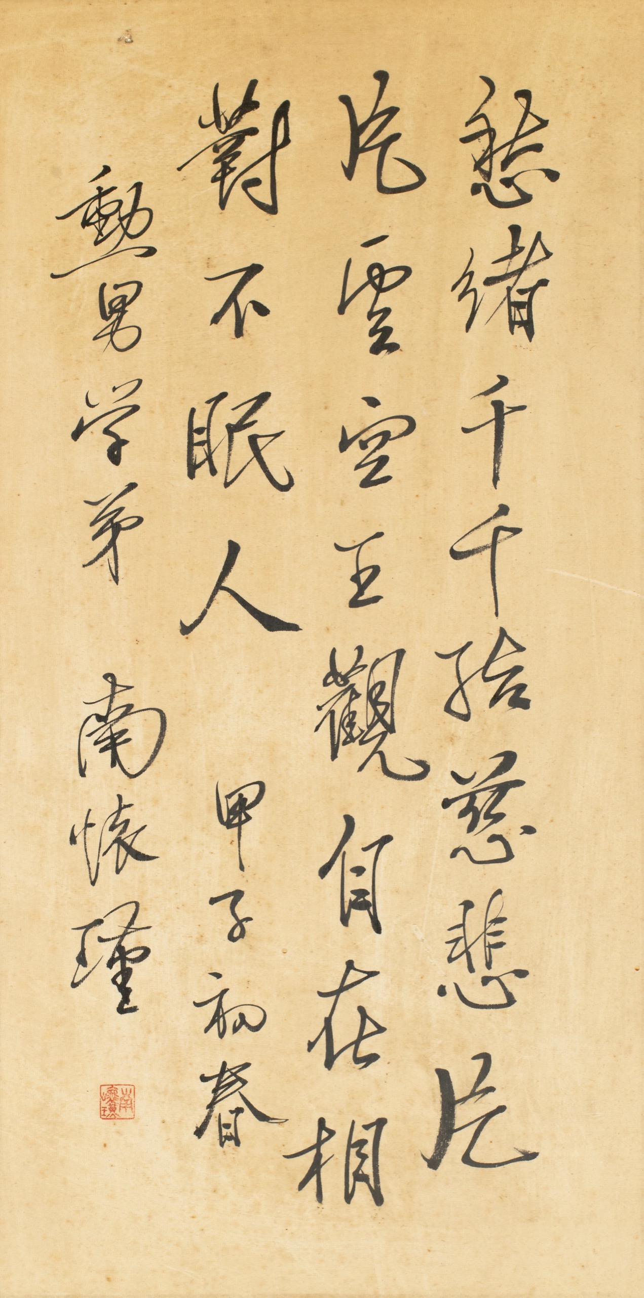 首頁 拍品總覽 2025秋季 share Lot. 3149 南懷瑾Nan Huai-Jin 1918-2012 行書自作詩 年代:1984 NT$ 120,000-200,000RMB¥ 24,000-40,000HK$ 30,000-50,000 媒材/尺寸 鏡框 水墨 紙本, 67x34cm 款識 愁緒千千結,慈悲片片雲。空王觀自在,相對不眠人。甲子初春,勳男學弟,南懷瑾。 鈐印 南懷瑾(朱)。 來源 上款人:周勳男教授。 出版/備註 周勳男教授專題 登記競投 返回拍品列表 拍品推薦 3080 溥心畬 懷戒臺寺古松 預估價:NT$ 2,000,000-3,000,000 2025秋季 3216 曾菊莊(畫)、馬紹文(題) 柳陰仕女 預估價:NT$ 10,000-30,000 2025秋季 3308 朱玖瑩 書法四屏 預估價:NT$ 30,000-50,000 2025秋季 3223 劉墉 手卷書法 預估價:NT$ 200,000-300,000 2025秋季 3163 胡佩衡、潘齡皋、劉子久、趙元禮 名人書畫 成扇 預估價:NT$ 50,000-80,000 2025秋季 3144 溥心畬 幽人倚睡夢華胥 預估價:NT$ 300,000-500,000 2025秋季 3024 黃鼎 萬木奇峰 預估價:NT$ 200,000-300,000 2025秋季 3018 黃耀 英雄得爵 預估價:NT$ 80,000-120,000 2025秋季 3200 吳昌碩 荔枝圖 預估價:NT$ 100,000-150,000 2025秋季 3050 吳昌碩 石鼓文條幅 預估價:NT$ 400,000-600,000 2025秋季