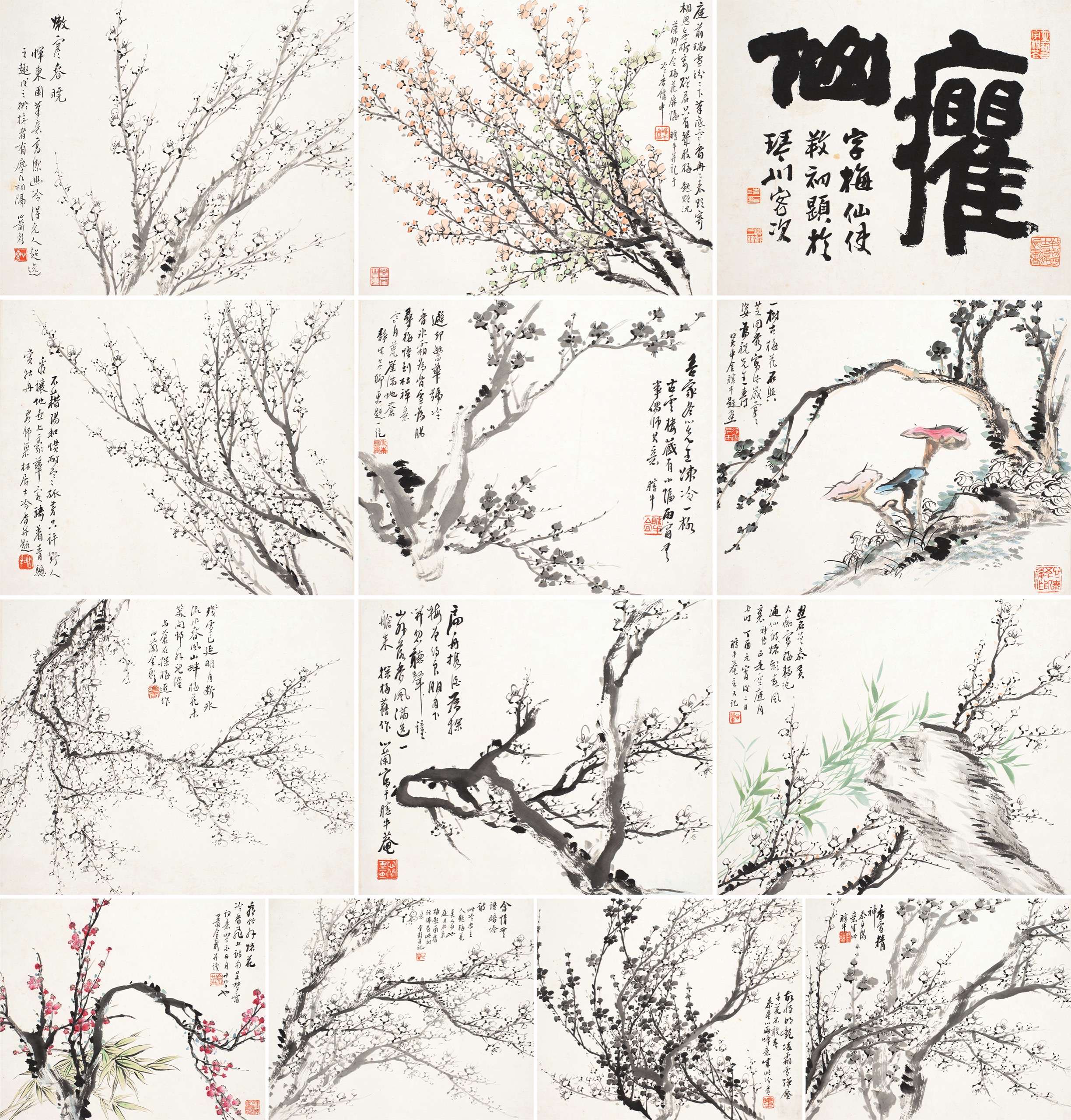 1.癯仙。字梅仙使䍩初題於琴川客次。2.庭前端雪紛紛下,筆底寒香冉冉來。欲寄相思無所寄,贈君只有幾枝梅。題贈沈藻卿大令梅花屏幅,瞎牛并記于冷香館中。3.嫩寒春曉。惲東園筆意高潔幽冷,得元人超逸之趣,後之擬橅者有塵凡相隔。心蘭□。4.一樹古梅花,石與芝同秀。寫此歲寒姿,為祝先生壽。吴中金瞎牛題畫。5.吾家冬心先生至踈冷一格,古雲樓藏有小幅,雨窗無事偶師其意。瞎牛。避卻繁華號冷香,冰霜為骨雪為腸。尋梅悟到枯禪意,寒月荒崖滿地蒼。靜坐無聊更題一絕。6.不藉陽和慣耐寒,孤芳只許野人看。讓地世上豪華客,騎著青驄賞牡丹。畧師巢林居士,冷香并題。7.畫石曾參黃大痴,寫梅猶記逋仙詩。神傳疎影春風裏,正是空庭月上時。丁酉元宵後二日,瞎牛菴主又記。8.扁舟携酒為探梅,曾約良朋月下開。忽聽聲鐘山外落,香風滿送一艙來。探梅舊作,心蘭寫于瞎牛菴。9.殘雪已延明月,斷氷流水春風。山畔梅花未□,笑問邨外兒僮。与蒼石探梅近作,心蘭金□。10.香雪精神。參白陽意成此,瞎牛。11.故將明艷凌霜雪,彈壓千花不敢春。參冬心、兩峰意成此冷香。12.含情無語暗吟詩。此冷香主人題梅花美人句也。庭月照來梅影圅香,彷彿有此詩意。金□(蘭)并記。13.看竹外踈花,冷香飛上詩句。吴梦窗詞意。時丁酉正月廿九日也。心蘭金□并識。