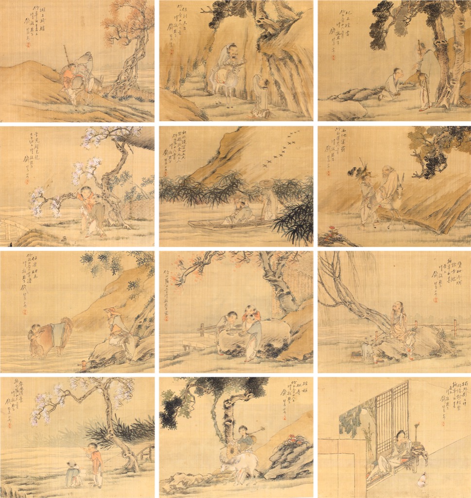 西池宴罷。仿新羅山人筆。清谿樵子錢慧安。雙柑斗酒聽黃鸝,橅華秋岳原本。清谿樵子錢慧安。獨卧影為伴,閑情對短檠。橅華秋岳原本,清谿樵子錢慧安。。圮上授書。仿玉壺山人筆。清谿樵子錢慧安。伯樂相馬。仿改玉壺畫灋。清谿樵子錢慧安。春風得意。擬白陽山人筆。清谿樵子錢慧安。位列天台。仿玉壺山人大意,清谿樵子錢慧安。湖上騎驢。仿華秋岳本。清谿樵子錢慧安。曾見顧見龍先有此本。清谿樵子錢慧安。秋水纔深四五尺,埜航洽受兩三人。仿白陽山人筆。清谿樵子錢慧安。仿白陽山(人)筆。清谿樵子錢慧安。瑤姬獻壽。仿玉壺山人本,清谿樵子錢慧安。