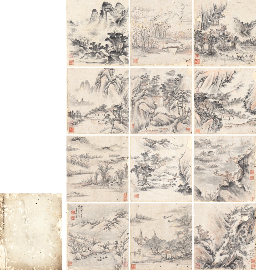 1.子青(朱)、仁鏡之印(白)。2.藻川(朱)、曾有此(朱)。3.乙巳生(朱)、仁鏡之印(白)。4.藻川(朱)。5.藻川(朱)、張之萬印(白)。6.乙巳生(朱)、仁鏡之印(白)。7.張之萬印(白)、子青(朱)、藻川(朱)。8.藻川(朱)。9.方氏子藻川書画之章(朱)。10.張之萬印(白)、藻川(朱)、曾有此(朱)。11.仁鏡之印(白)。12.張之萬印(白)、子青(朱)、藻川(朱)、萬有同春(朱)。