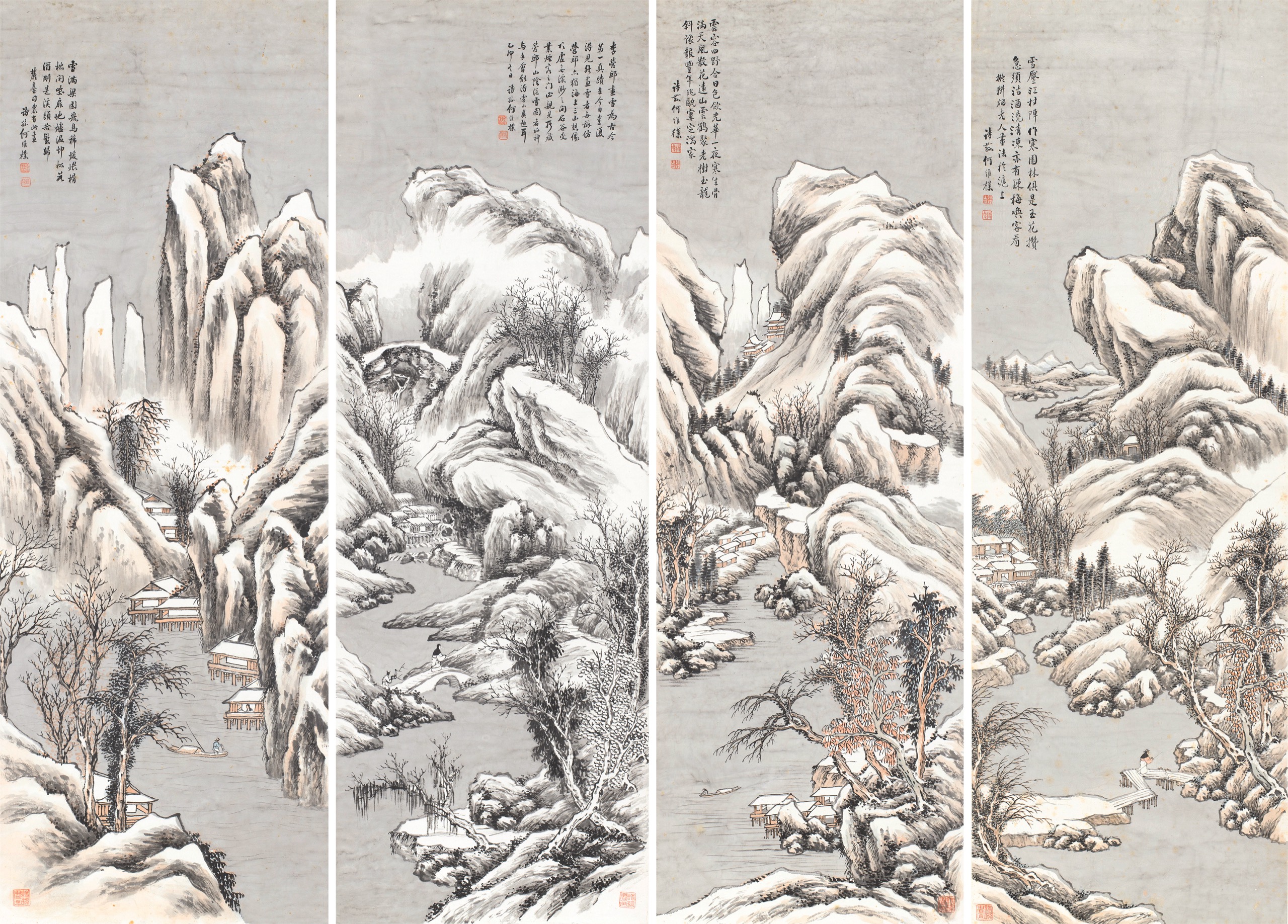 1.雪壓江村陣作寒,園林俱是玉花攢。急須沽酒澆清凍,亦有疎梅喚客看。擬耕烟老人畫法於滬上,詩孫何維樸。2.雲容四野合,日色欽光華。一夜寒生骨,滿天風散花。遠山雲鶴聚,老樹玉龍斜。豫報豐年兆,甌窶定滿家。詩孫何維樸。3.李營邱畫雪為古今第一,真蹟再今日豈復得見,然畫者美稱仿營邱,亦猶海上三山,想像於虛無縹緲之間,石谷受業煙容之門,必親見所藏,營秋山陰泛雪圖者故神與手會,能得雪山真趣耳,乙卯冬日詩孫何維樸。4.雪滿梁園飛鳥稀,暖煨榾柮閉柴扉。地爐溫却松花酒,剛是溪頭拾蟹歸。麓臺司農有此畫,詩孫何維樸。