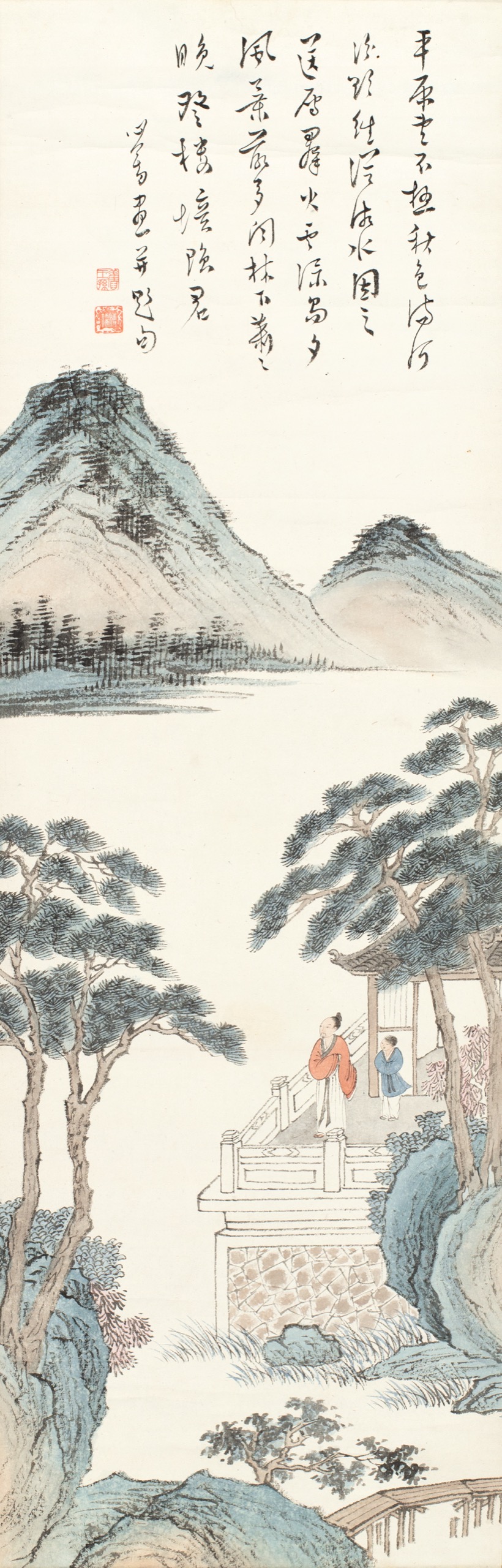 平原望不極,秋色滿河汾。欲往從湘水,因之送鳫羣。火雲涼易夕,風葉落多聞。林下蕭蕭晚,登樓憶隐君。心畬畫并題句。
