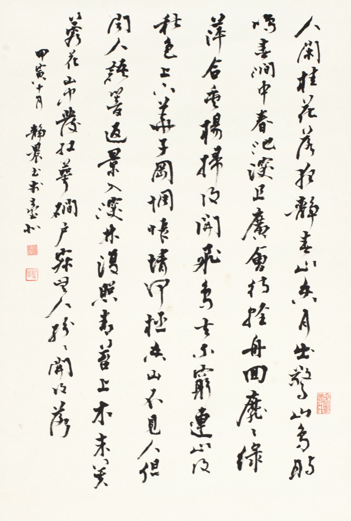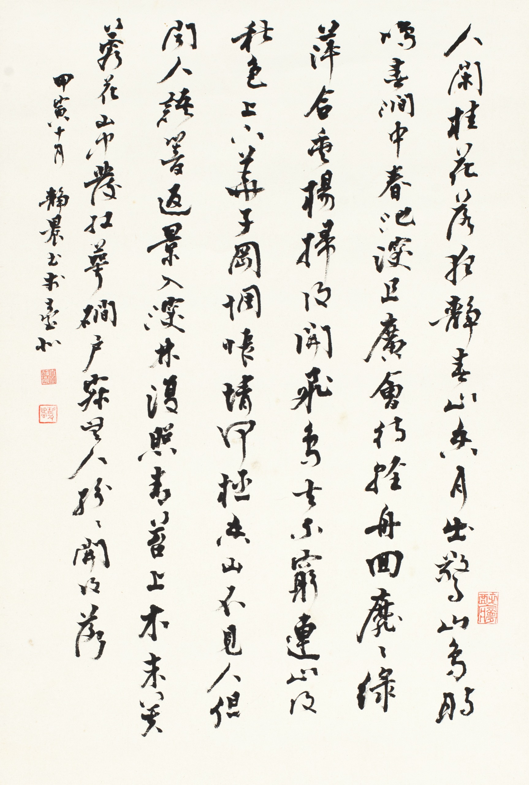 首頁 拍品總覽 2025秋季 share Lot. 3261 臺靜農Tai Jing-Non 1902-1990 行草王維《鳥鳴澗》 年代:1974 NT$ 100,000-150,000RMB¥ 20,000-30,000HK$ 25,000-37,500 媒材/尺寸 立軸 水墨 紙本, 60x41cm 款識 人閒桂花落,夜靜春山空。月出驚山鳥,時鳴春澗中。春池深且廣,會待輕舟回。靡靡綠萍合,垂楊掃復開。飛鳥去不窮,連山復秋色。上下華子岡,惆悵情何極。空山不見人,但聞人語響。返景入深林,復照青苔上。木末芙蓉花,山中發紅萼。澗戶寂無人,紛紛開且落。甲寅十月,靜農書於臺北。 鈐印 臺靜農(白)、靜者(朱)、醉夢(朱)。 登記競投 返回拍品列表 拍品推薦 3303 高泉性潡 隱元禪師像贊 預估價:NT$ 110,000-150,000 2025秋季 3255 歐豪年 花鳥蟲魚(四件一組) 預估價:NT$ 80,000-120,000 2025秋季 3340 陳大羽 豆藤花蟲圖 預估價:NT$ 30,000-50,000 2025秋季 3328 佚名 田園佳趣 預估價:NT$ 20,000-30,000 2025秋季 3150 南懷瑾(題)、鄭月波(畫) 游魚圖 預估價:NT$ 80,000-120,000 2025秋季 3186 張善子 虎嘯山林 預估價:NT$ 150,000-250,000 2025秋季 3011 吳琴木 曉閣讀易圖 預估價:NT$ 50,000-80,000 2025秋季 3246 周澄 松下逭暑 預估價:NT$ 200,000-300,000 2025秋季 3216 曾菊莊(畫)、馬紹文(題) 柳陰仕女 預估價:NT$ 10,000-30,000 2025秋季 3091 溥心畬 草書斗方 預估價:NT$ 80,000-150,000 2025秋季
